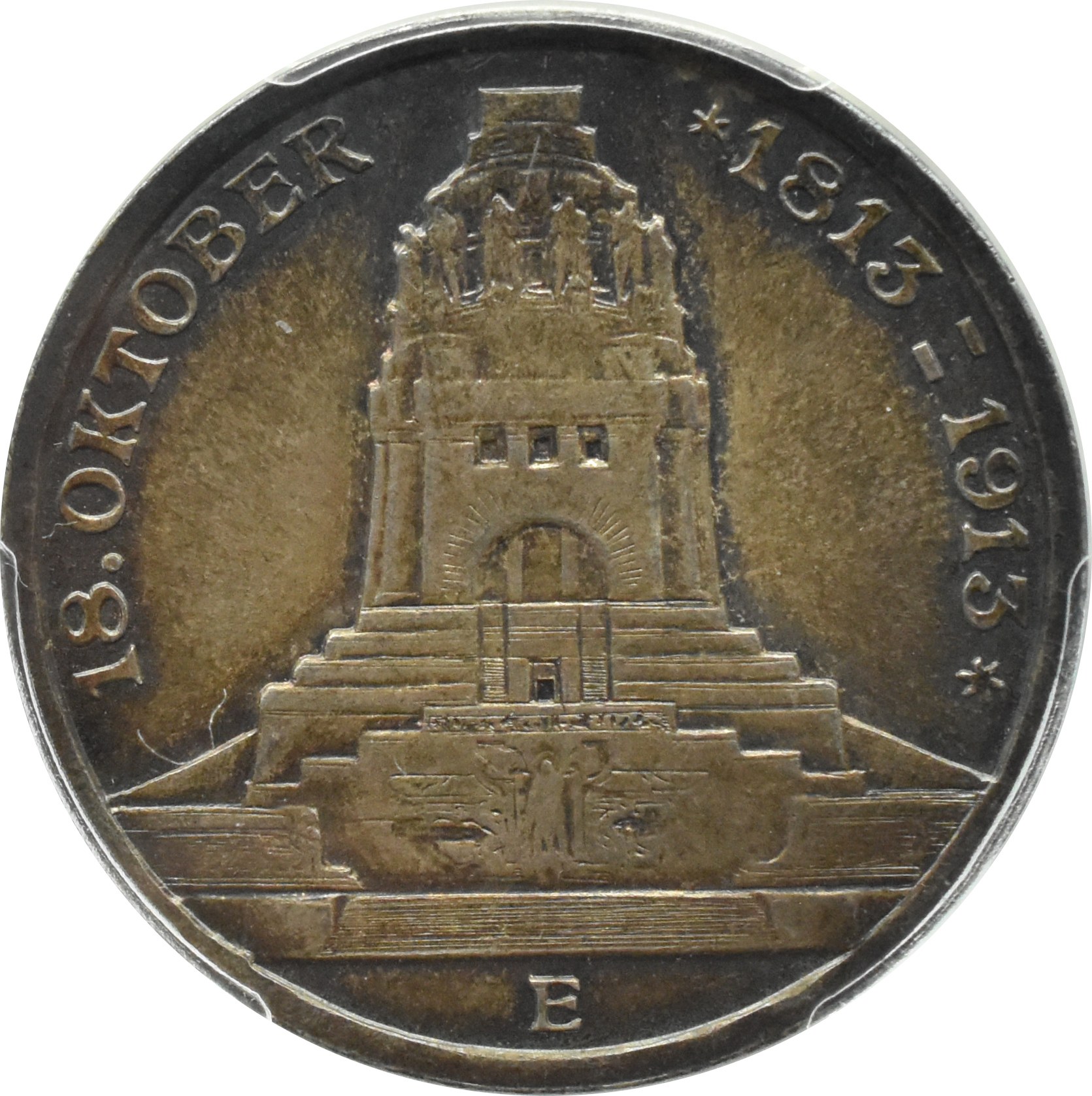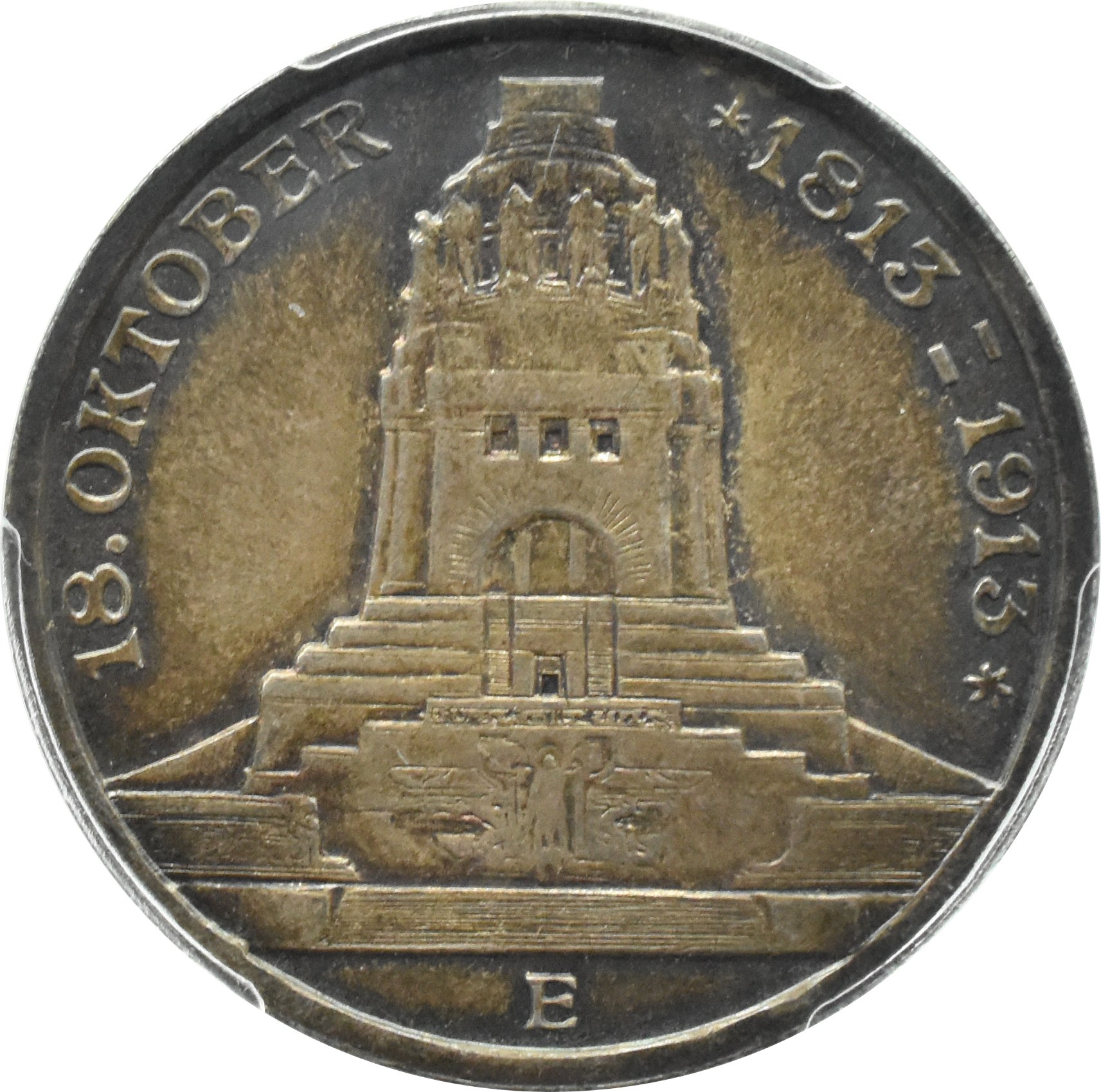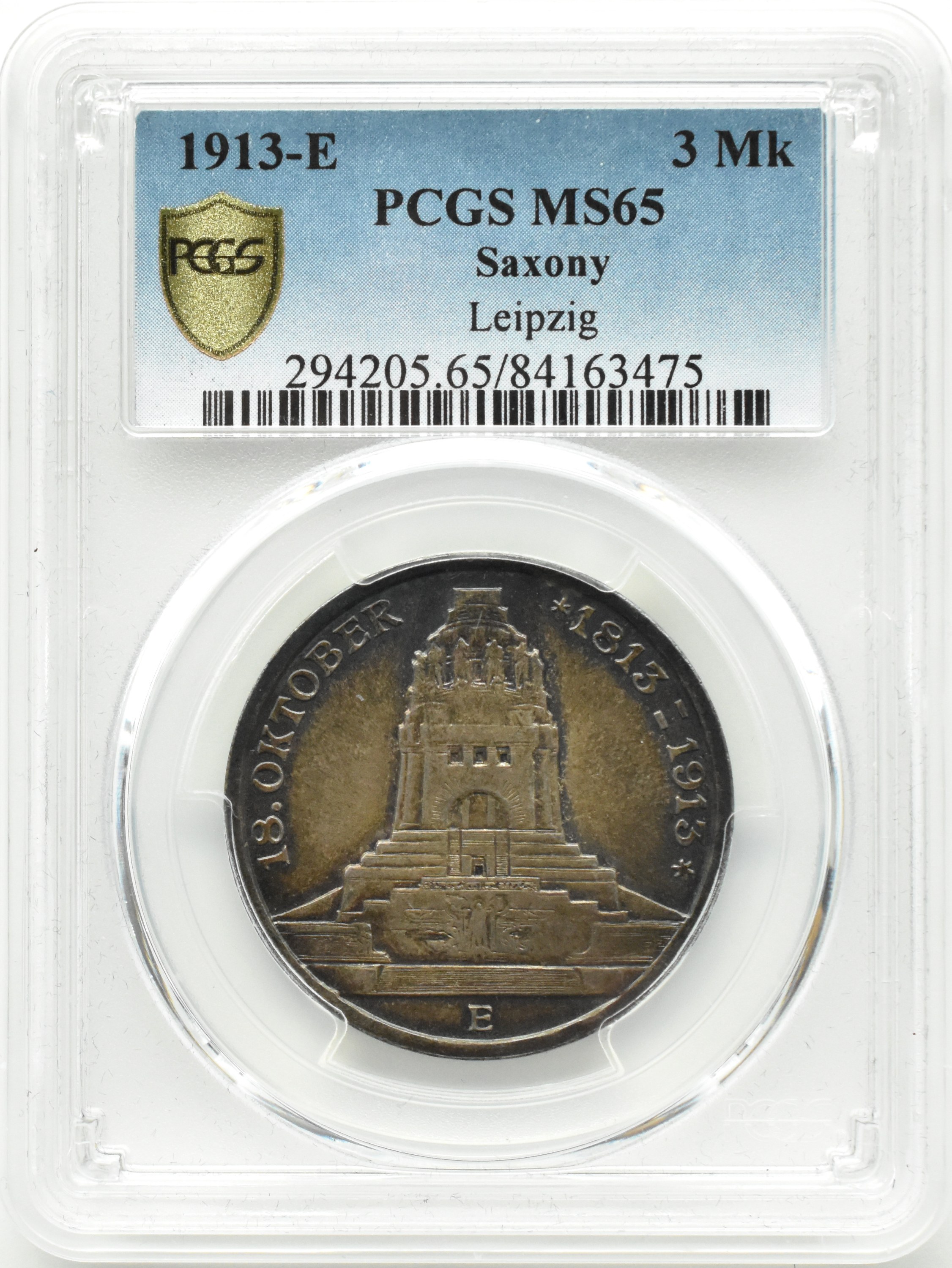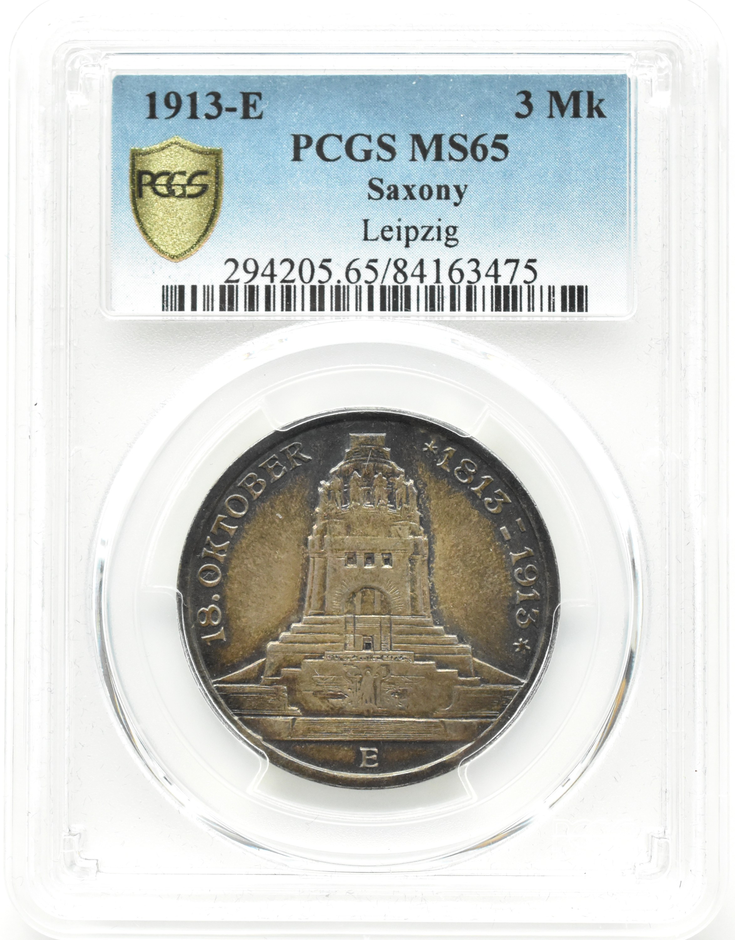 Niemcy, Saksonia, 3 marki 1913, Wieża - upamiętniająca 100-lecie Zwycięstwa pod Lipskiem, mennica Drezno, PCGS MS65