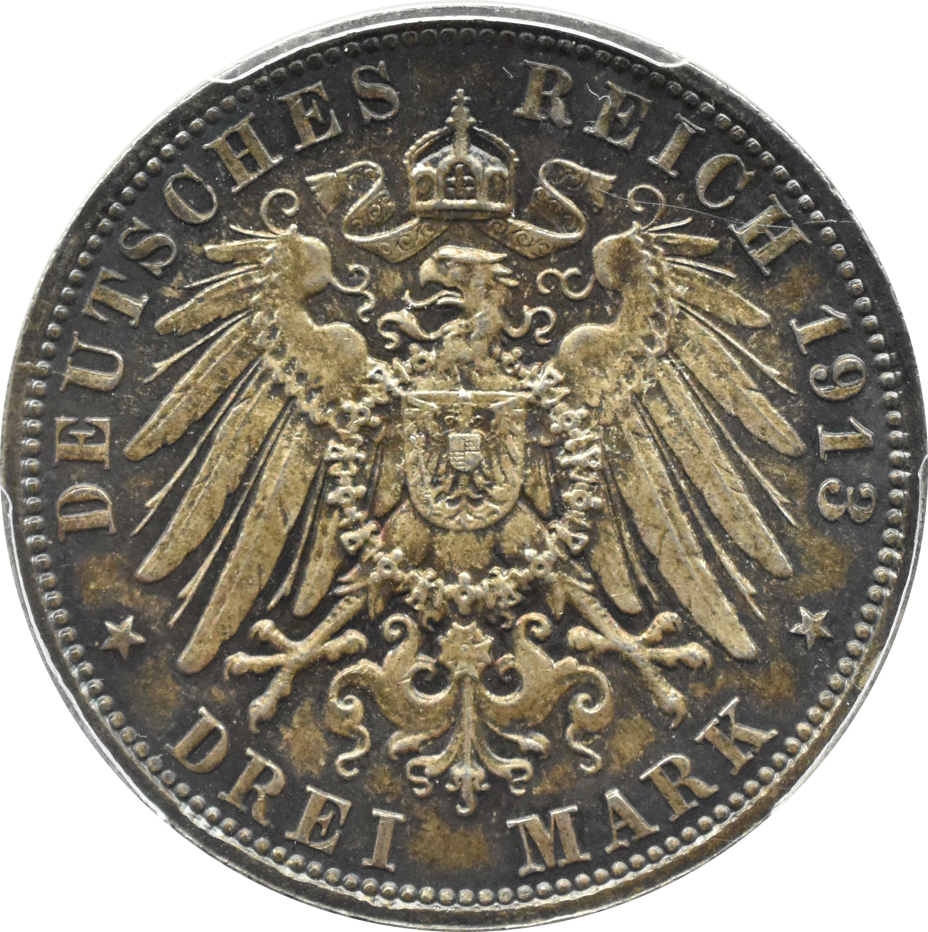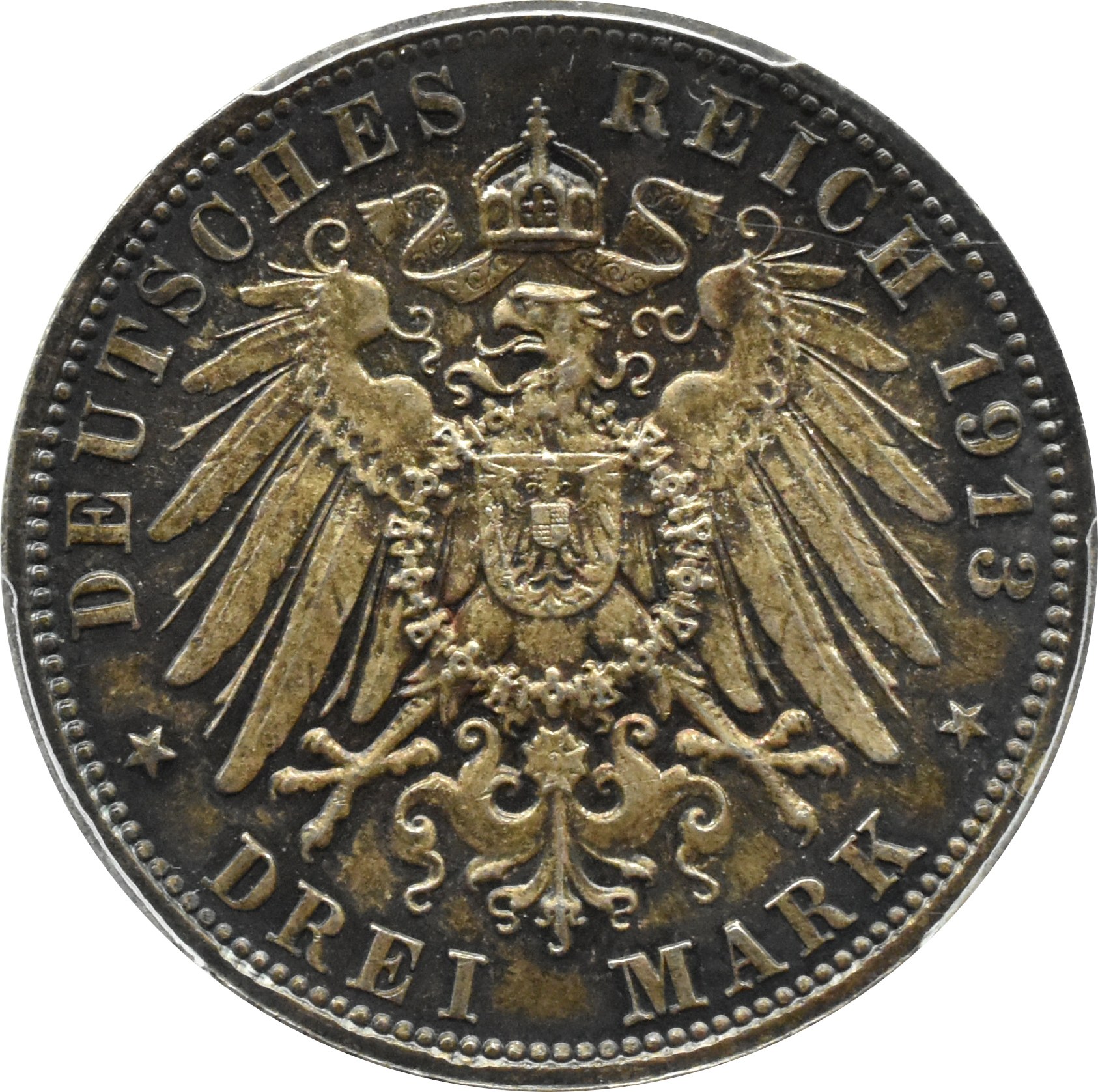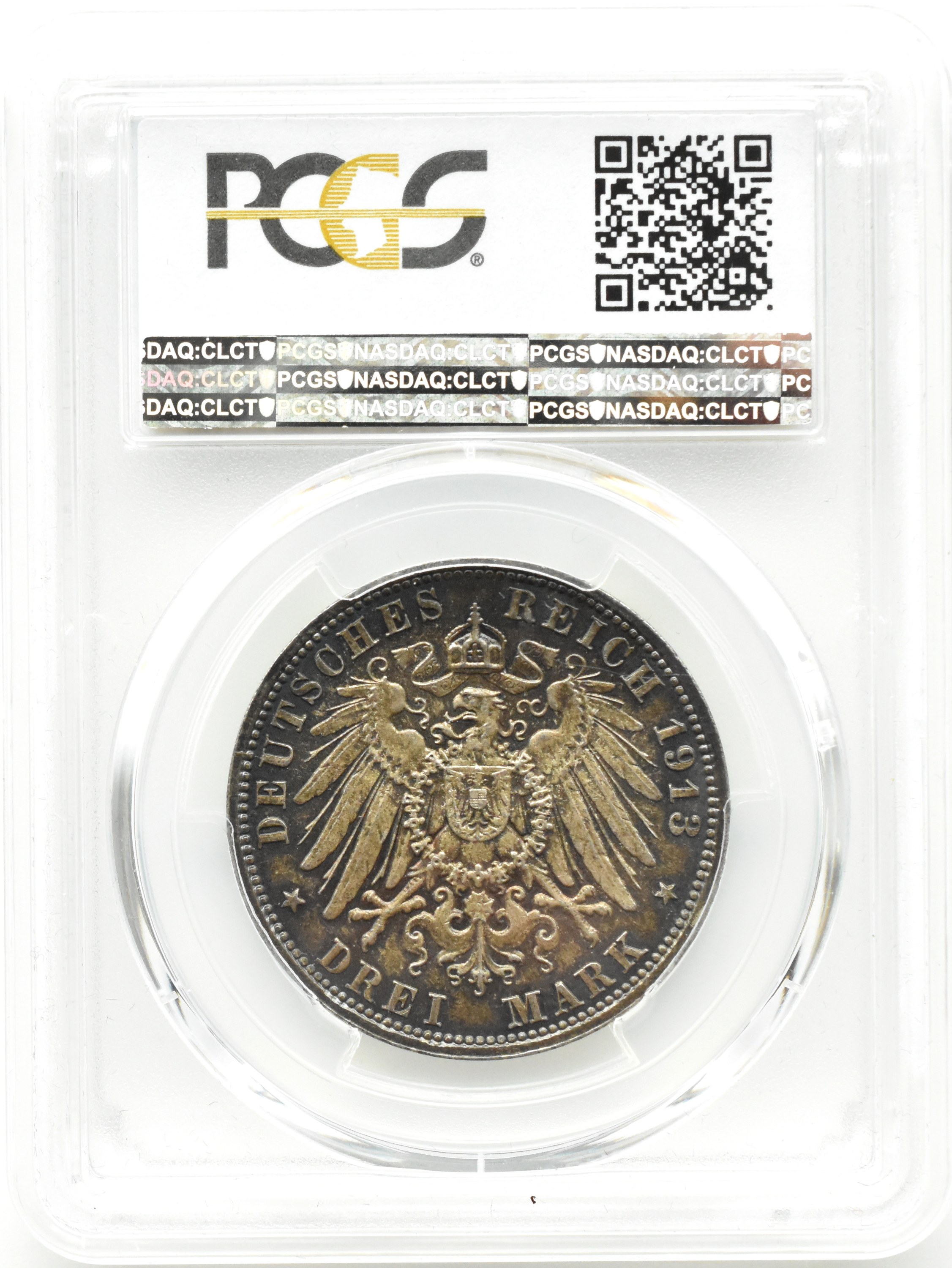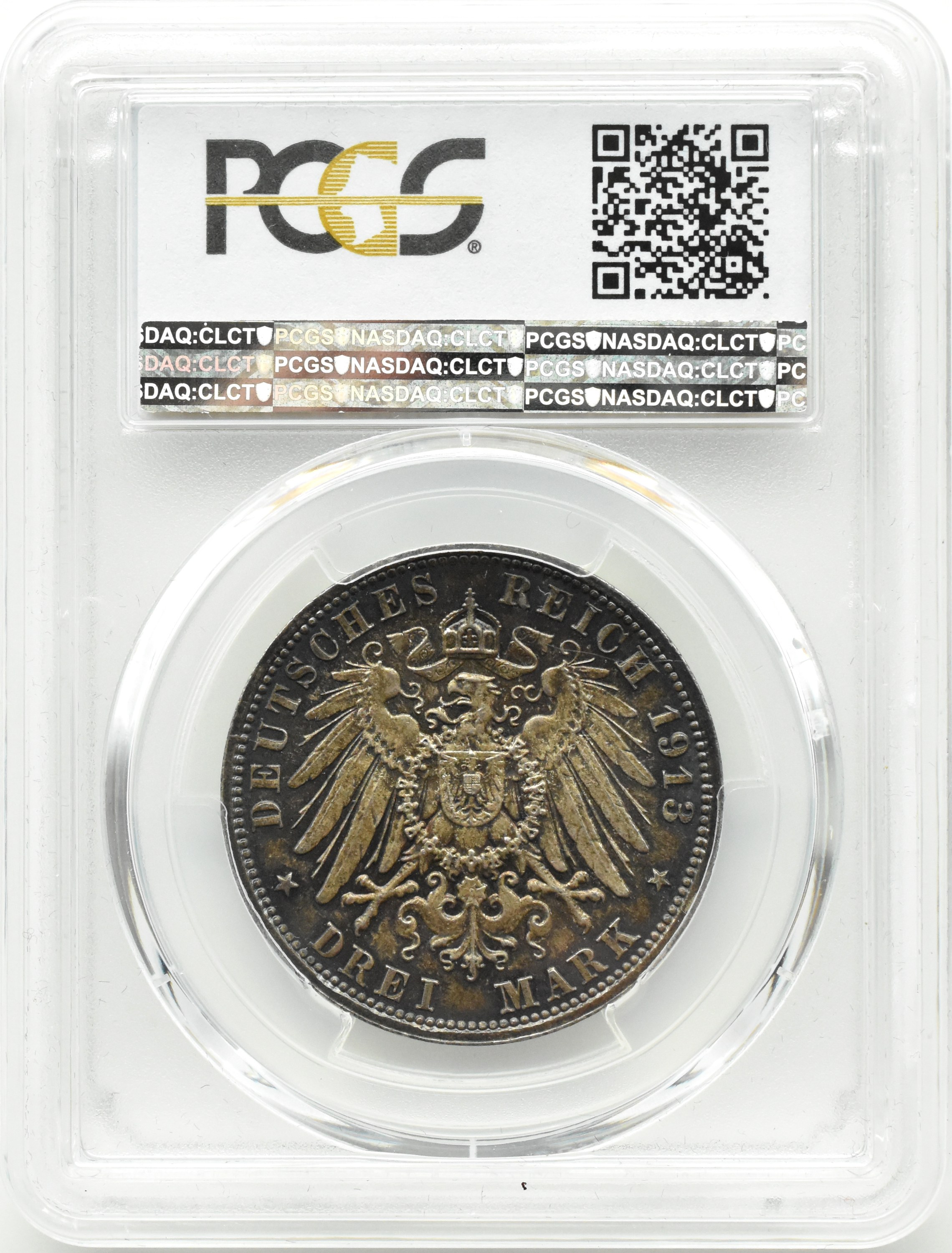 Niemcy, Saksonia, 3 marki 1913, Wieża - upamiętniająca 100-lecie Zwycięstwa pod Lipskiem, mennica Drezno, PCGS MS65