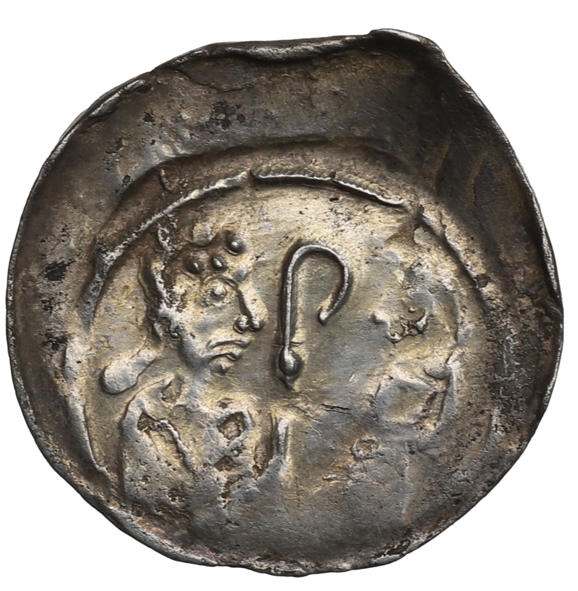 Awers: półpostać Biskupa z pastorałem czytającego z księgi trzymanej przez mniejszą postać;