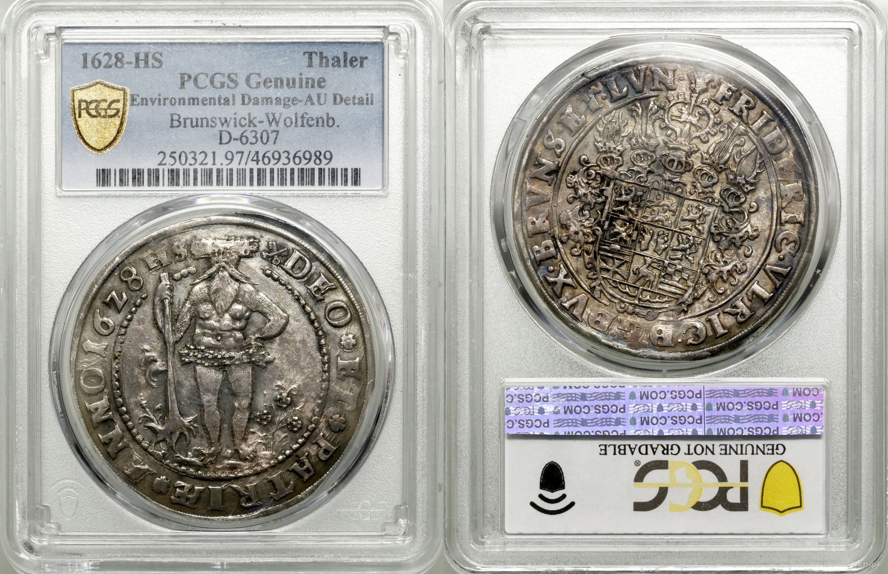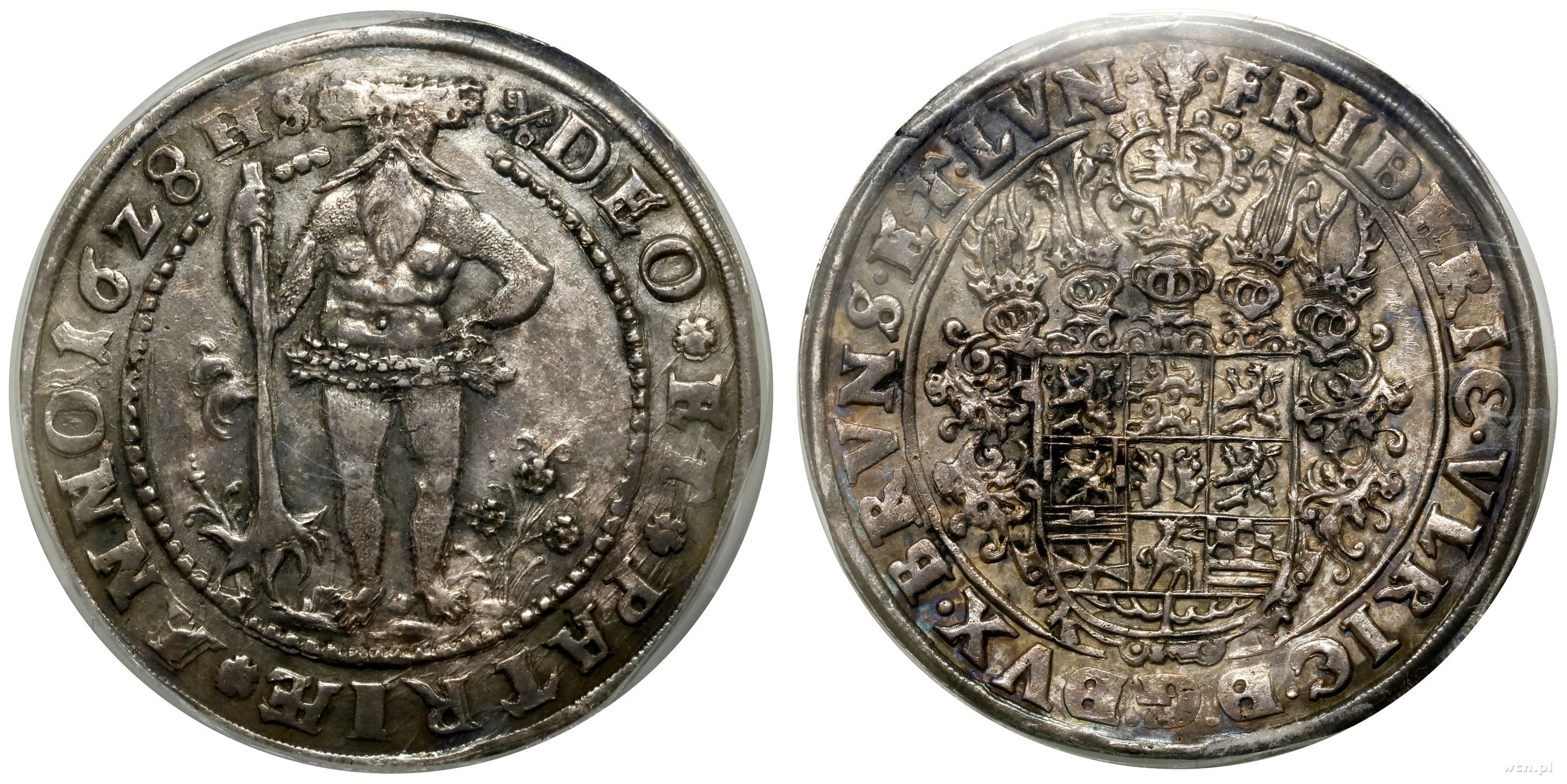 Aw: Jedenastopolowa tarcza herbowa, FRIDERIC VLRIC D G DVX BRVNS ET LVN; Rw: Barbarzyńca, trzymający prawą ręką drzewo, lewa oparta na biodrze, DEO ET PATRIAE ANNO 16Z8
