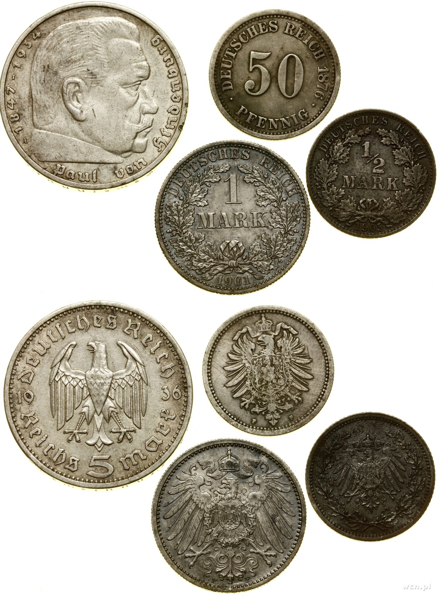 50 fenigów 1876 F, 1 marka 1901 F (Stuttgart), 1/2 marki 1905 A, 5 marek 1936 A (Berlin)