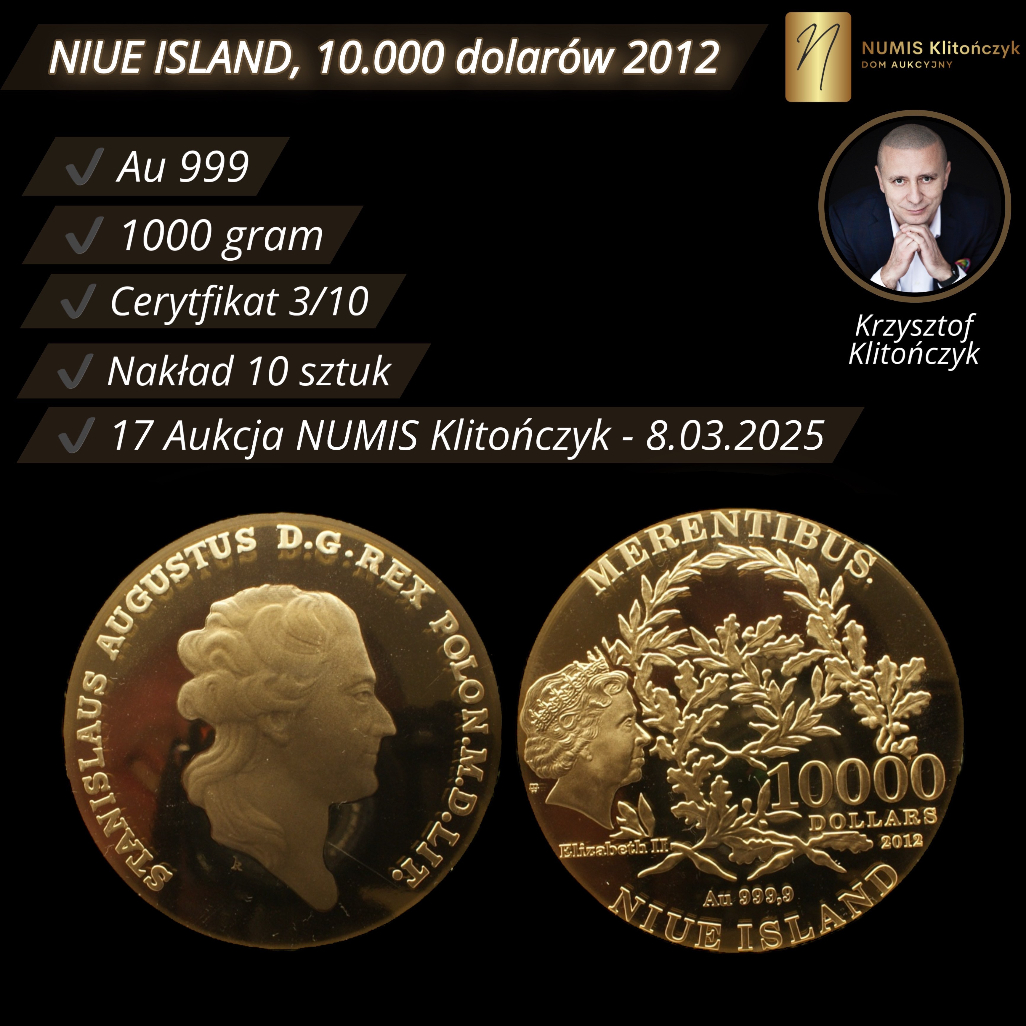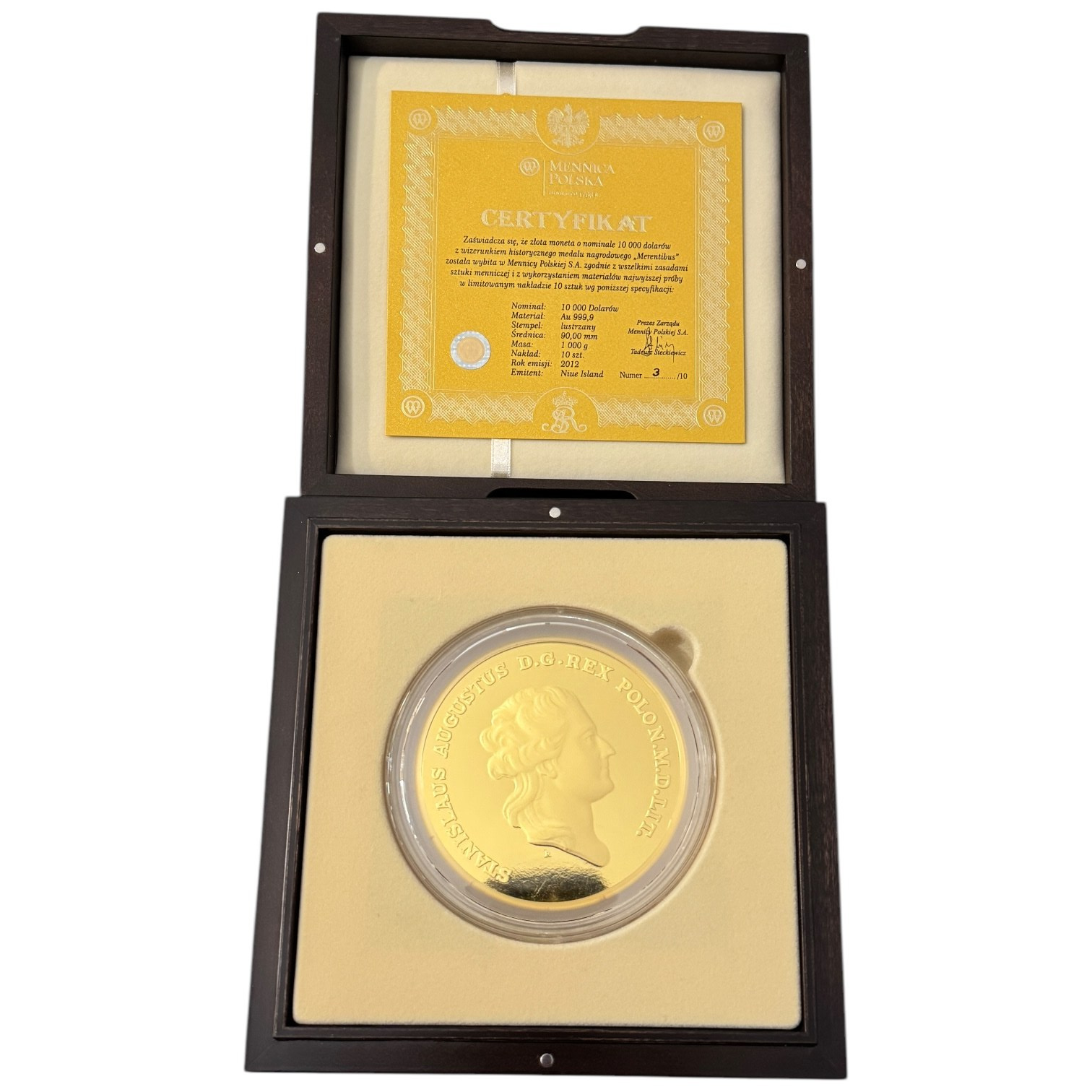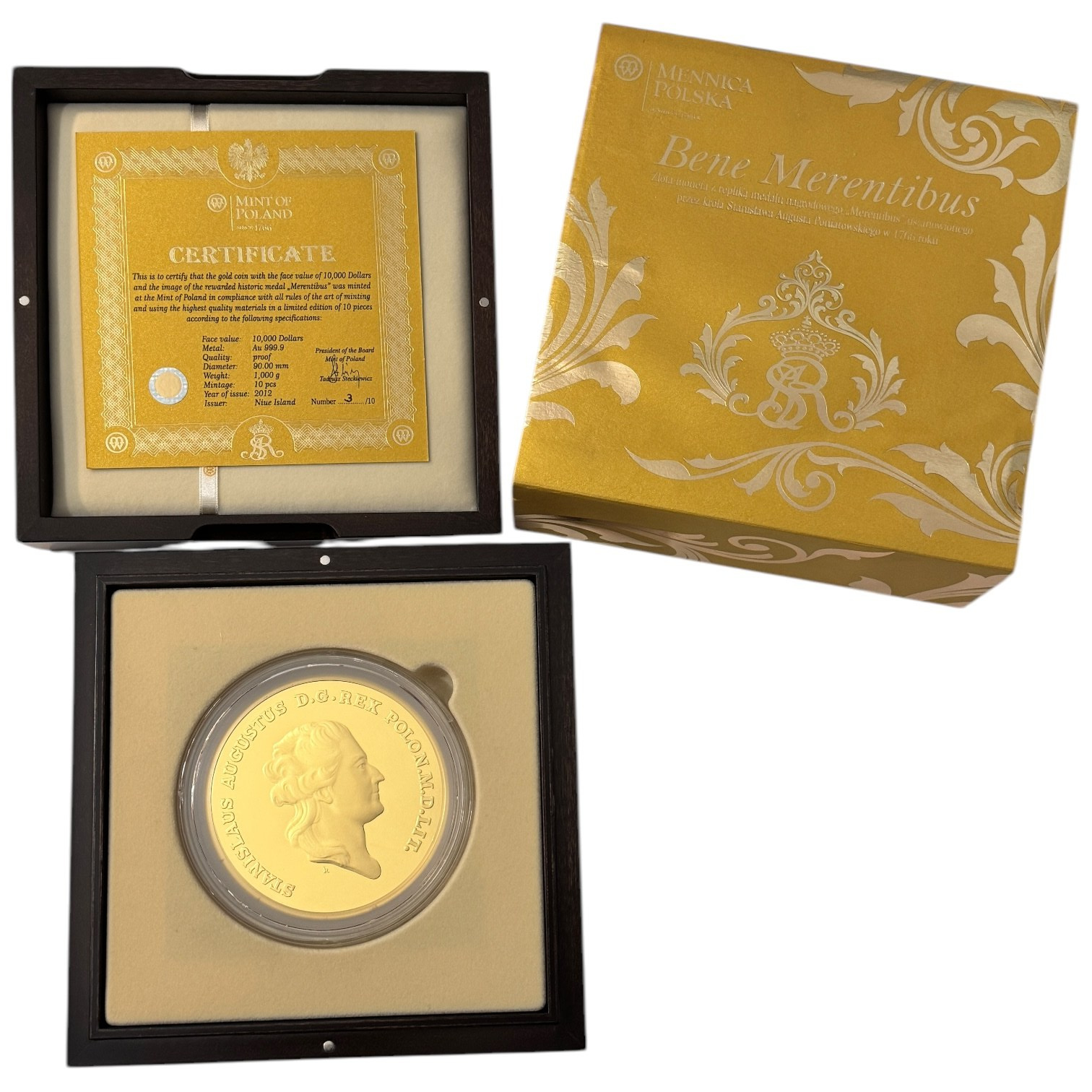 Oferujemy na aukcji wyjątkową złotą monetę o wadze 1 kilograma, wybitą przez Mennicę Polską w 2012 roku dla Niue Island. Moneta nosi nazwę „Bene Merentibus” (łac. „Tym, którzy zasłużyli”) i jest repliką medalu ustanowionego przez króla Stanisława Augusta Poniatowskiego w 1766 roku, którym honorowano osoby zasłużone dla polskiej nauki, sztuki, przemysłu oraz myśli technicznej.