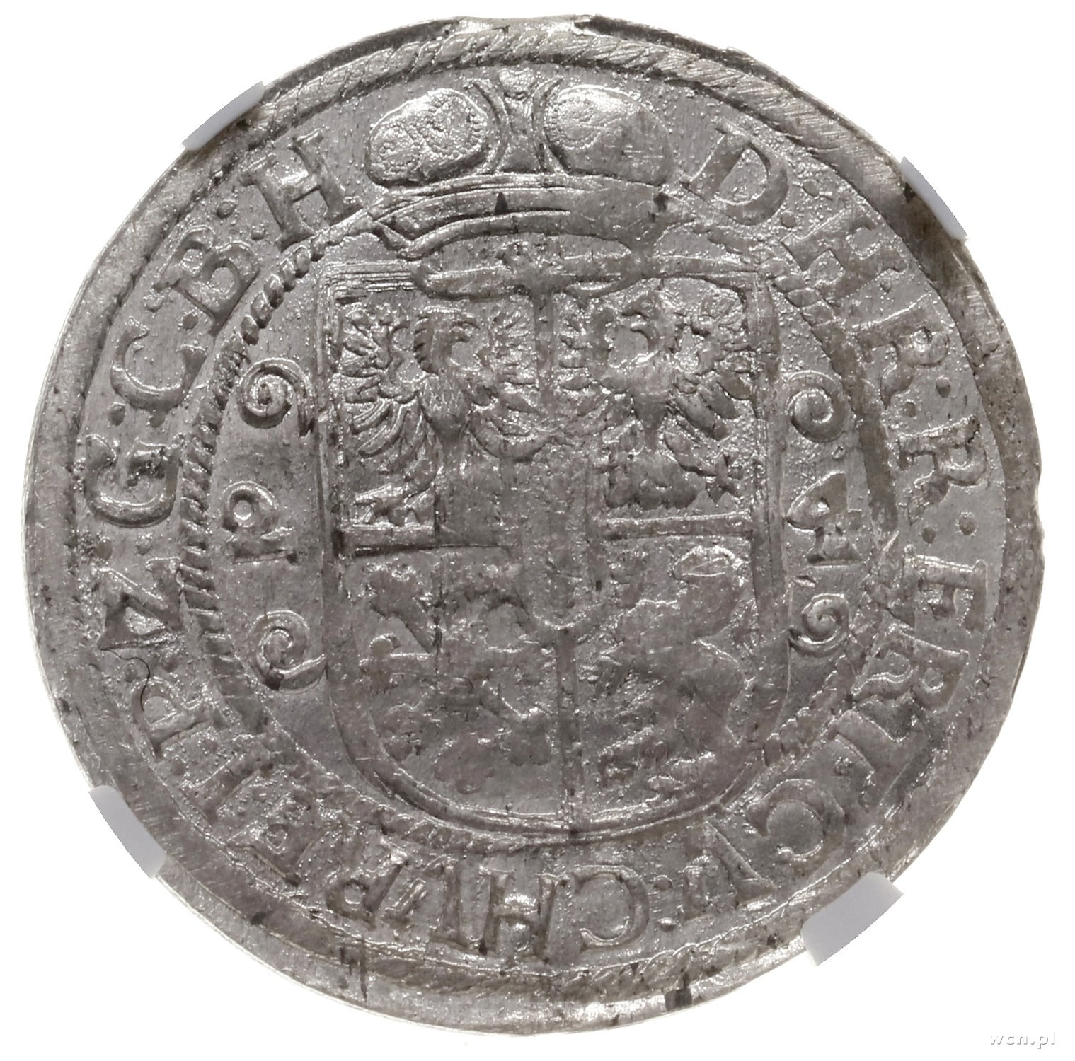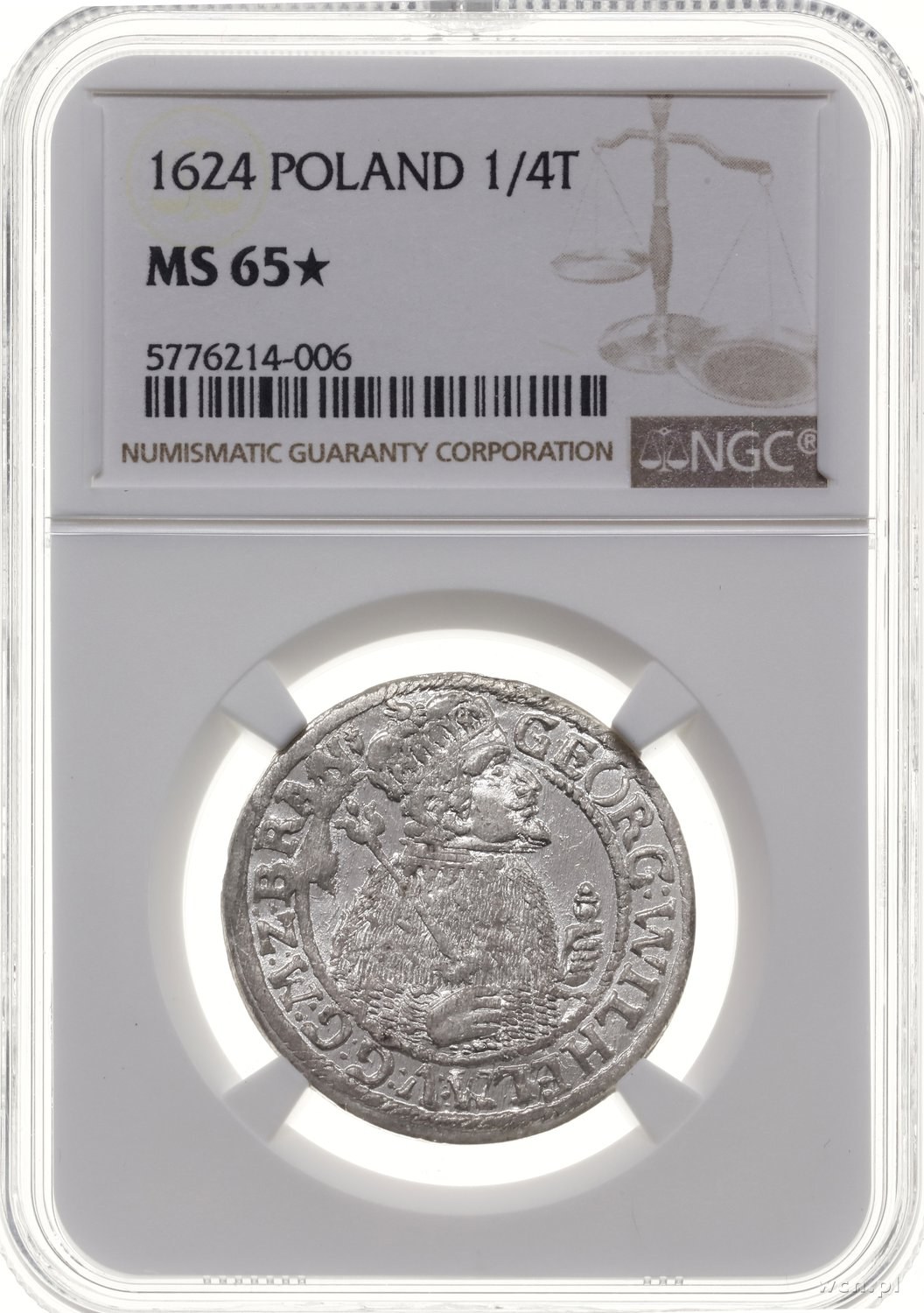 Jerzy Wilhelm (1619–1640), Ort, 1624, Królewiec; popiersie księcia w płaszczu elektorskim, znak menniczy na awersie, końcówka BRAN; Olding 41a, Shatalin GW24-1, Slg Marinburg 1448; moneta w pudełku firmy NGC nr 5776214-006 z oceną MS65✭, wybity nieco uszkodzonym stemplem awersu, ale prześlicznie zachowany egzemplarz z pełnym blaskiem menniczym, niezwykle rzadki w tym stanie zachowania.