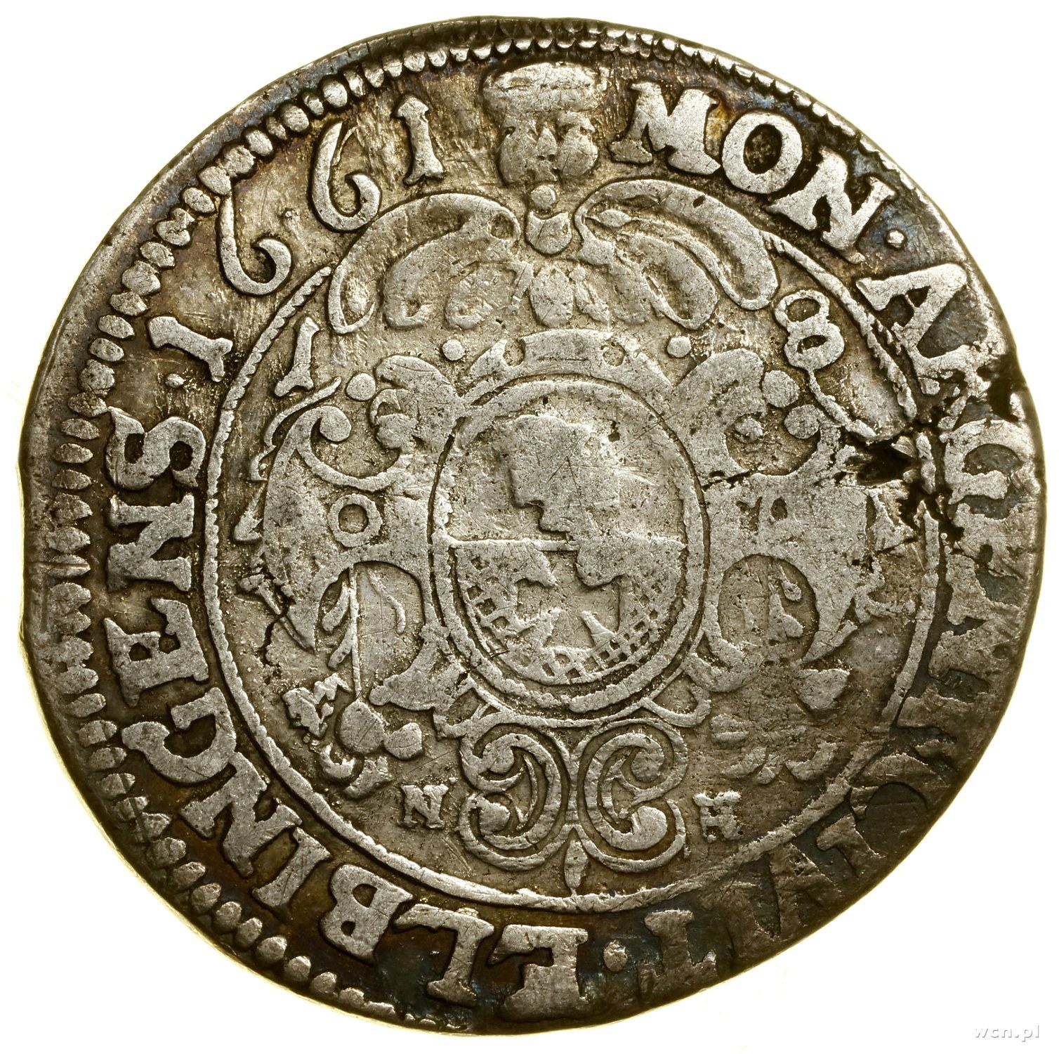 miasto Elbląg, Ort, 1661, Elbląg; CNCE 290 (R3), H-Cz. 2205 (R1), Kop. 7127 (R3), Pfau 503, Shatalin ELB61-I-2 (R3), Slg Marienburg 9493, Tyszkiewicz 8 mk; krążek z końcówki blaszki; rzadki typ monety.