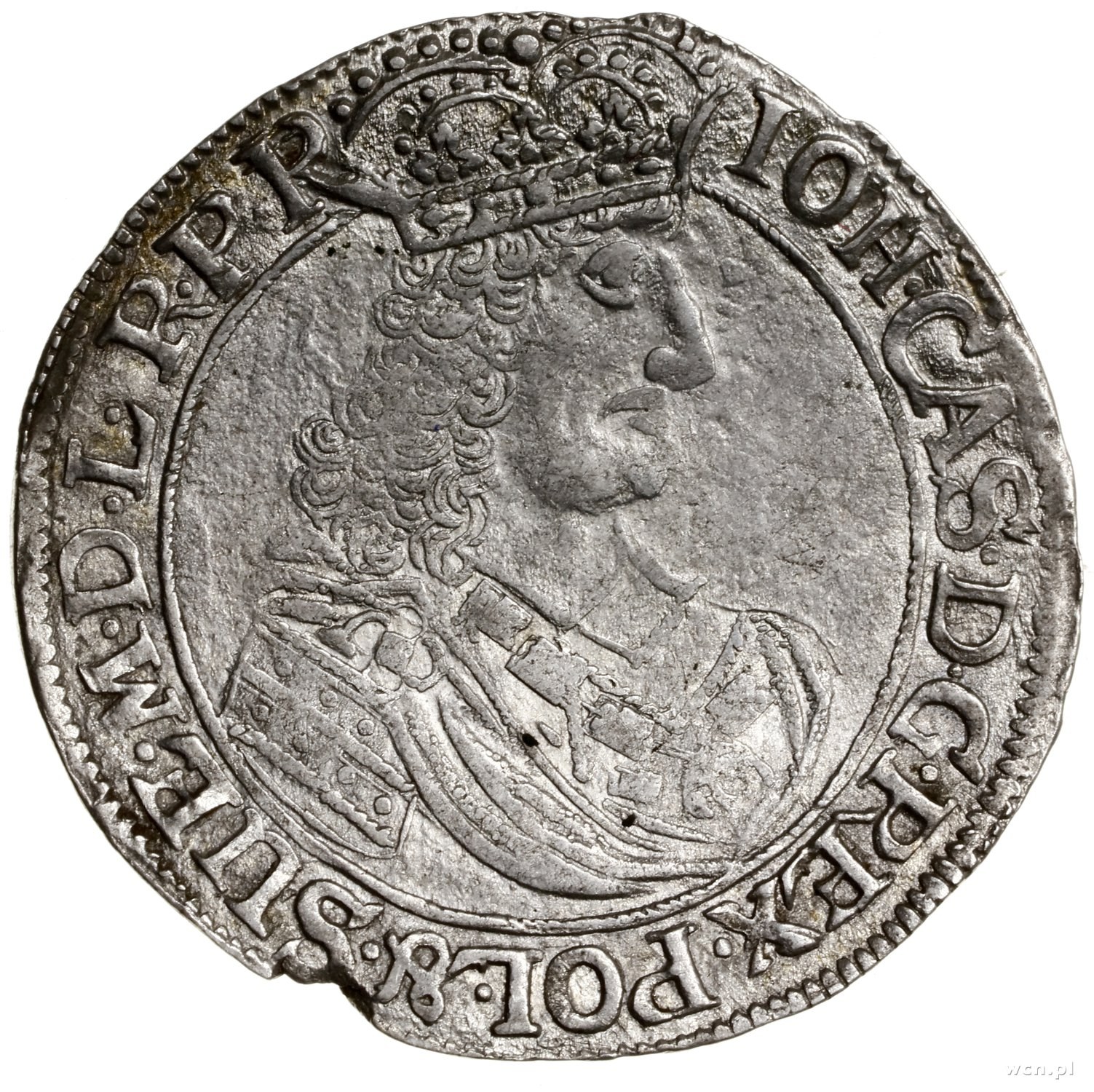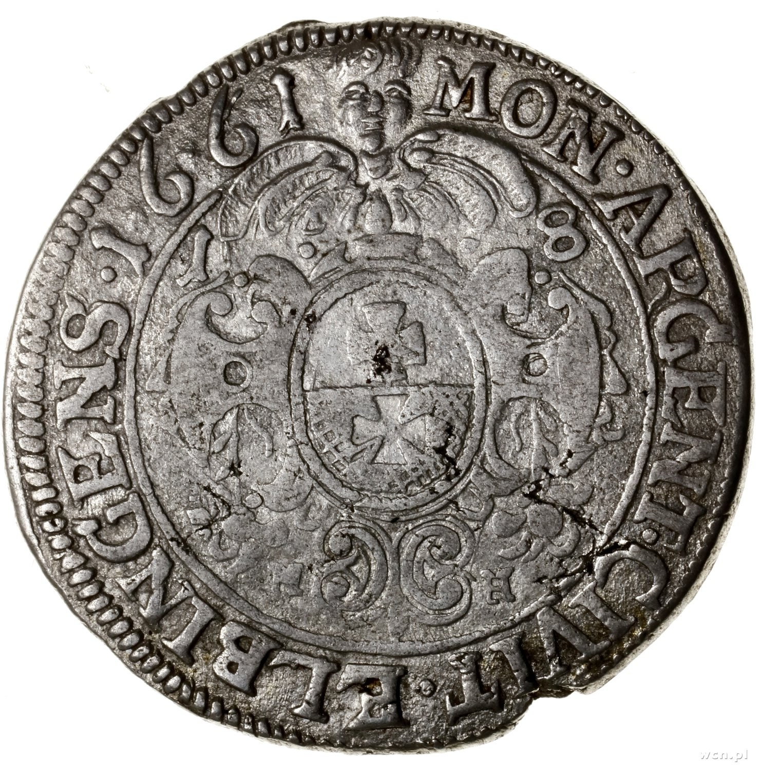 miasto Elbląg, Ort, 1661, mennica Elbląg; Aw: Popiersie króla w prawo, IOH CAS D G REX POL & SUE M D L R P R; Rw: Herb miasta Elbląg, w owalnym, zdobionym kartuszu, u góry nominał 1 - 8, u dołu litery N - H (Mikołaj Hennig - zarządca mennicy w latach 1652–1665), MON ARGENT CIVIT ELBINGENS; CNCE 290 (R3), Gum-H. 1968, H-Cz. 2205 (R1), Kop. 7127 (R3), Pfau 503, Slg Marienburg 9493, Tyszkiewicz 8 mk; wyszczerbienie na obrzeżu, bardzo rzadki.