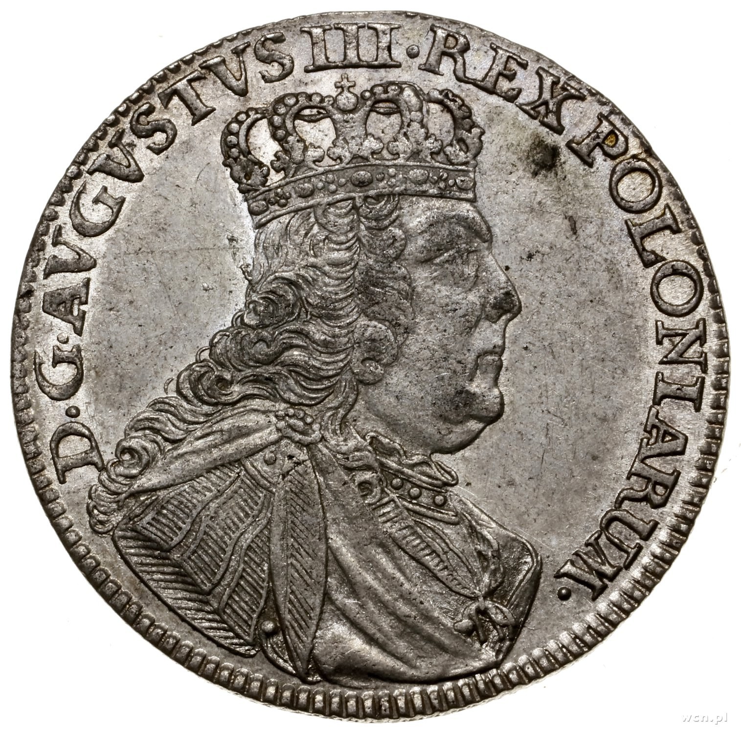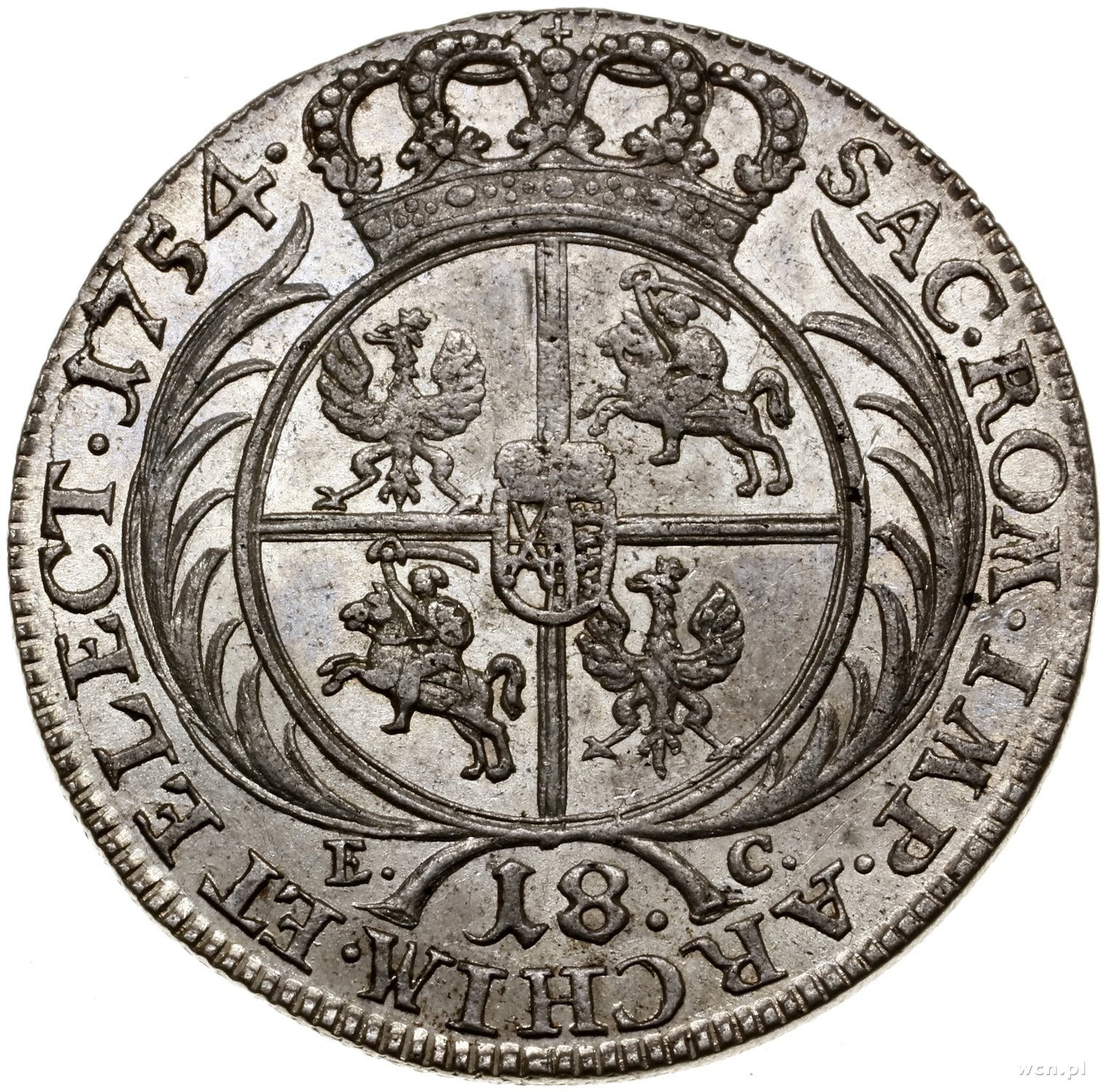 monety polsko-saskie, Ort, 1754 EC, Lipsk; wąskie popiersie z owalnym, żeberkowanym przekrojem naramiennika zbroi i odcięciem rękawa, twarz króla szczupła; Anuszczyk 54C.4.e, Kahnt 687 var. b, Kop. 2111, Merseb. 1779, Schön 20; piękny z ładnym połyskiem menniczym.
