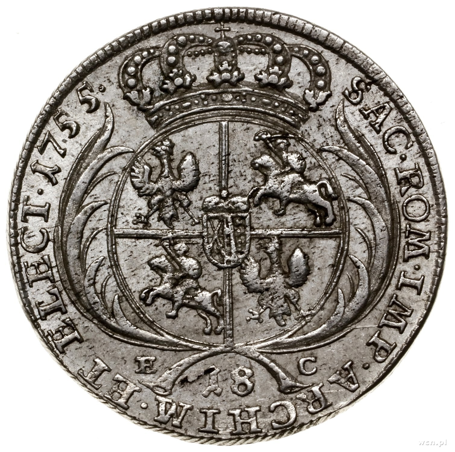 monety polsko-saskie, Ort, 1755 EC, Lipsk; masywne popiersie króla w szerokiej koronie, korony żeberkowana tylko na awersie, kropka po dacie, rzadki wariant z podwiesonymi w koronie perełkami; Anuszczyk 55A.2.d (R3), Kahnt 688 var. d, Kop. 2113, Merseb. 1782, Schön 20; pięknie zachowane.