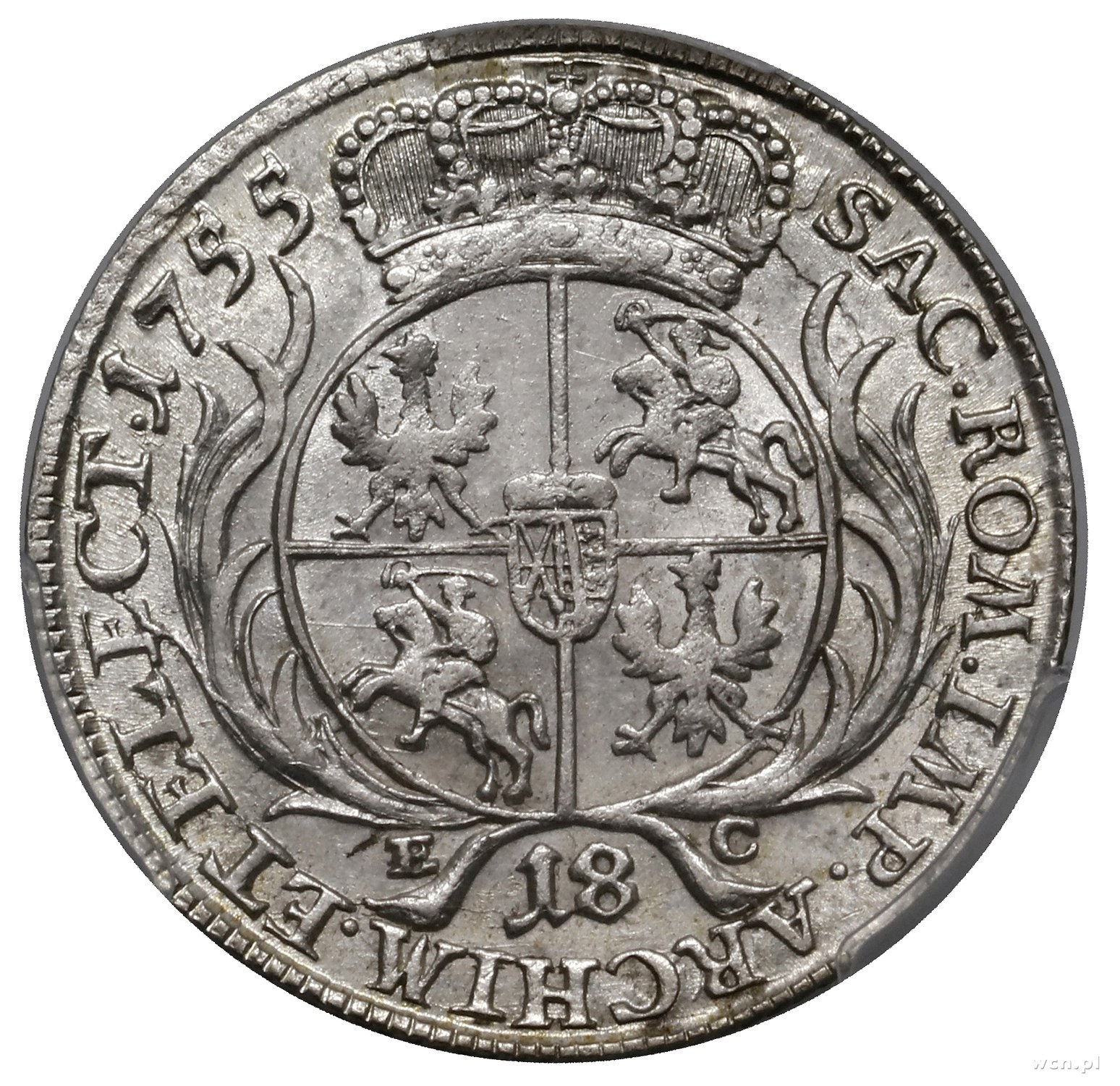 monety polsko-saskie, Ort, 1755, Lipsk; masywne popiersie króla w szerokiej koronie, zapinka króla z ośmioma kropkami, duże cyfry daty, brak kropki po niej; Anuszczyk 55A.3.a, Kahnt 688 var. d, Kop. 2113, Merseb. 1782, Schön 20; piękna moneta w pudełku firmy PCGS 168355.62/31326521 z oceną MS62.