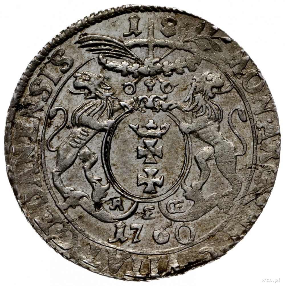 miasto Gdańsk, ort 1760, Gdańsk; odmiana z mieczem pomiędzy gałązkami palmowymi; Kahnt 725, CNG 421, Merseburger 1798, Slg. Marienburg 8636; bardzo ładny