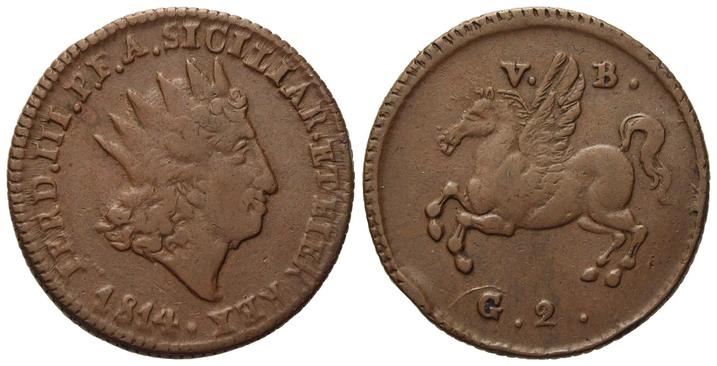 PALERMO. Regno di Sicilia. Ferdinando III di Borbone (1759 - 1816). 2 Grani 1814. Cu (6,05 g; 22,8 mm)
