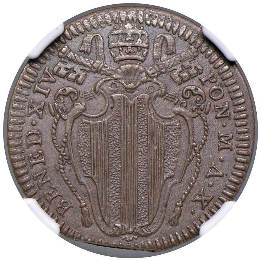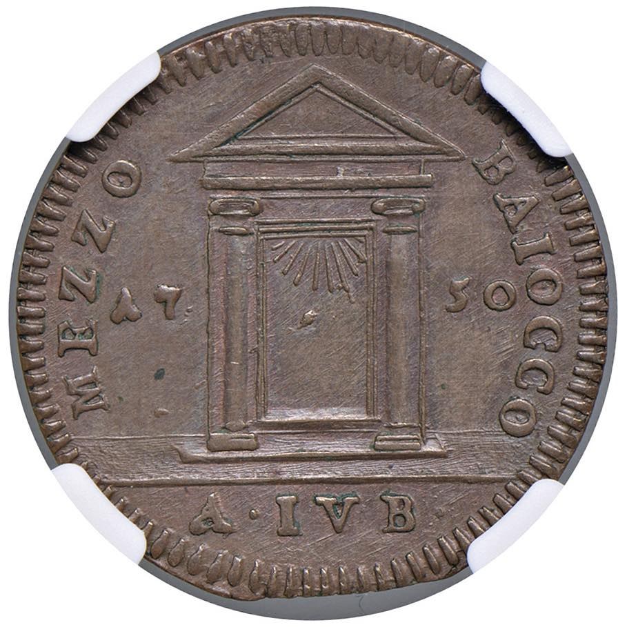 Benedetto XIV (1740-1758) Mezzo Baiocco 1750 - Munt. 205 CU In slab NGC MS 61 BN cod. 3934660-004. Top pop, miglior esemplare certificato NGC