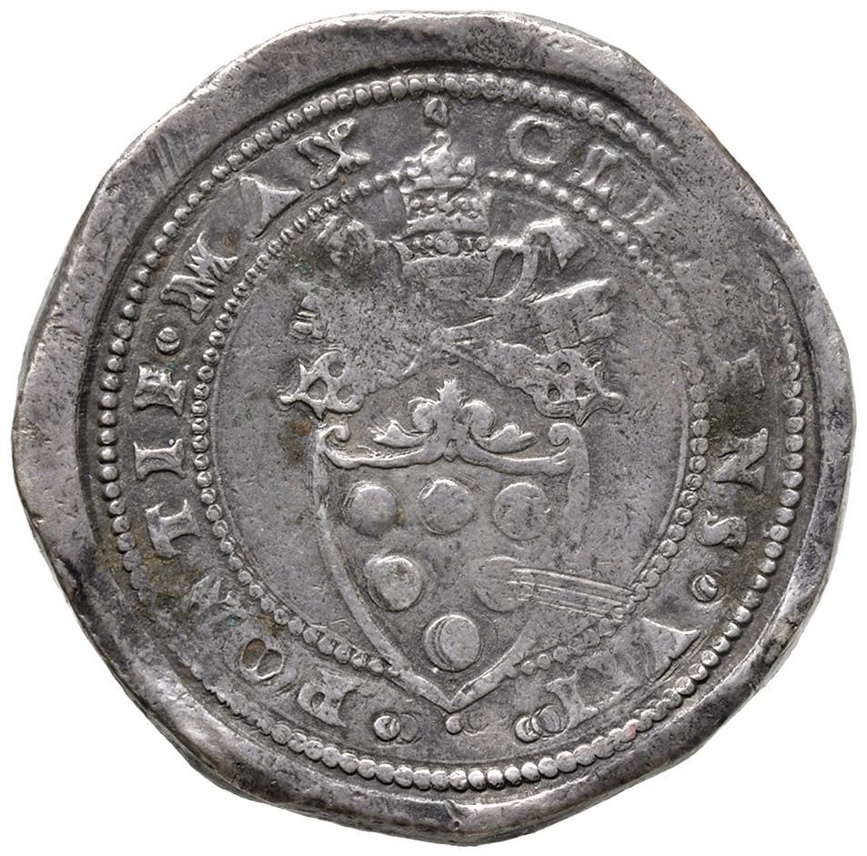 Clemente VII (1523-1534) Ducato ossidionale (1527) - Munt. 21 AG RRRR Sigillato FDC (sic) "esemplare eccezionale" da Eupremio Montenegro. Usuali debolezze e difetti di conio. Il cartellino del sigillo non indica il peso mentre il diametro è 38 mm. Una delle monete più affascinanti dell'intera serie pontificia, coniata in fretta e furia per pagare il riscatto per il papa prigioniero dei Lanzichenecchi che avevano preso Roma. Come noto, per coniare queste monete furono fusi gli argenti delle chiese di Roma. Per accelerare le operazioni di coniatura furono predisposti dei nominali in argento allora non circolanti ed equivalenti ai ducati d'oro poiché, evidentemente, il metallo giallo doveva essere insufficiente per raggiungere il prezzo pattuito.