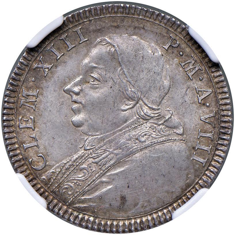 Clemente XIII (1758-1769) Quinto di scudo o doppio giulio 1766 VIII - Munt. 19b AG R In slab NGC MS 64 cod. 2806454-019. Top pop, miglior esemplare certificato NGC