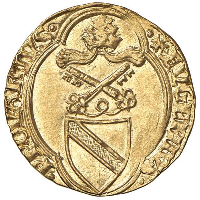 Eugenio IV (1431-1447) Ducato - Munt. 2 AU (g 3,54) RR Moneta di insolita qualità, lieve debolezza al R/, ma esemplare veramente di grande freschezza. Indubbiamente tra i migliori di quelli apparsi per questa tipologia. Nell'asta Nomisma 67, un esemplare dichiarato SPL, ha realizzato 3.500 euro + diritti.