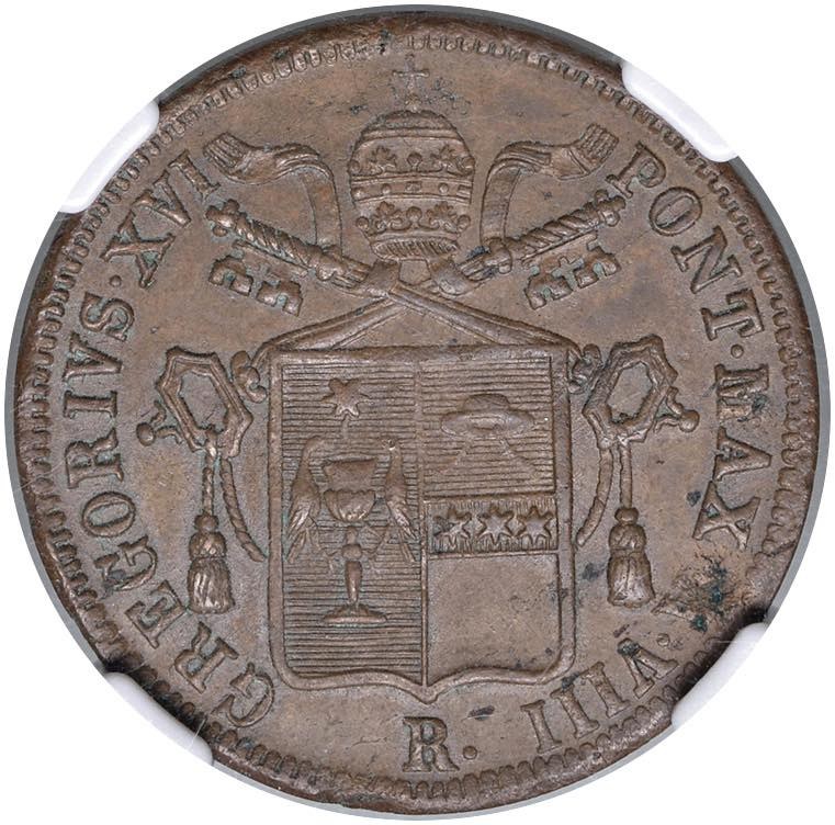 Gregorio XVI (1831-1846) Baiocco 1838/7 A. VIII - Nomisma 510 CU In slab NGC MS 62 BN cod. 2789369-024