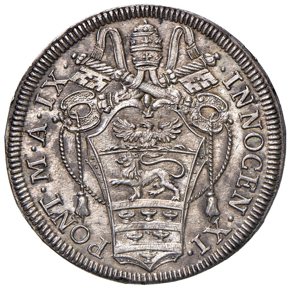 Innocenzo XI (1676-1689) Testone 1685 An. IX - Munt. 97 AG (g 9,13) R Esemplare di magnifica qualità, non circolato e dai rilievi perfettamente integri. Tondello corredato da una bellissima patina da monetiere e da bellissimi fondi brillanti.