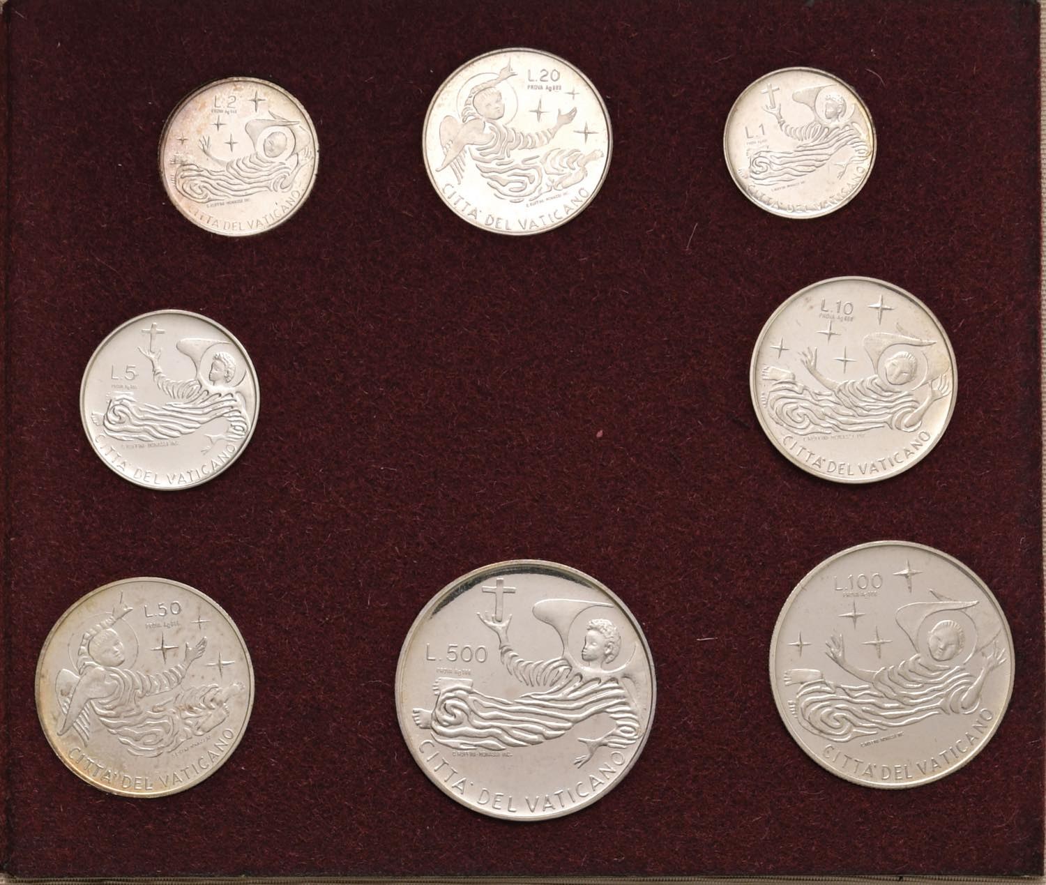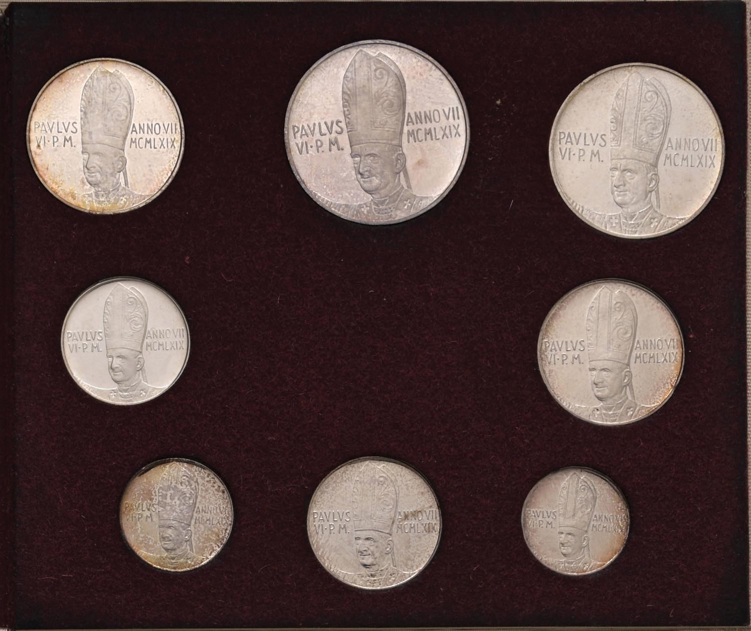 Paolo VI (1962-1978) Divisionale 1969 A. VII Prova in argento - AG RRR Tiratura di 100 serie complete. Lotto di otto monete in cartoncino originale