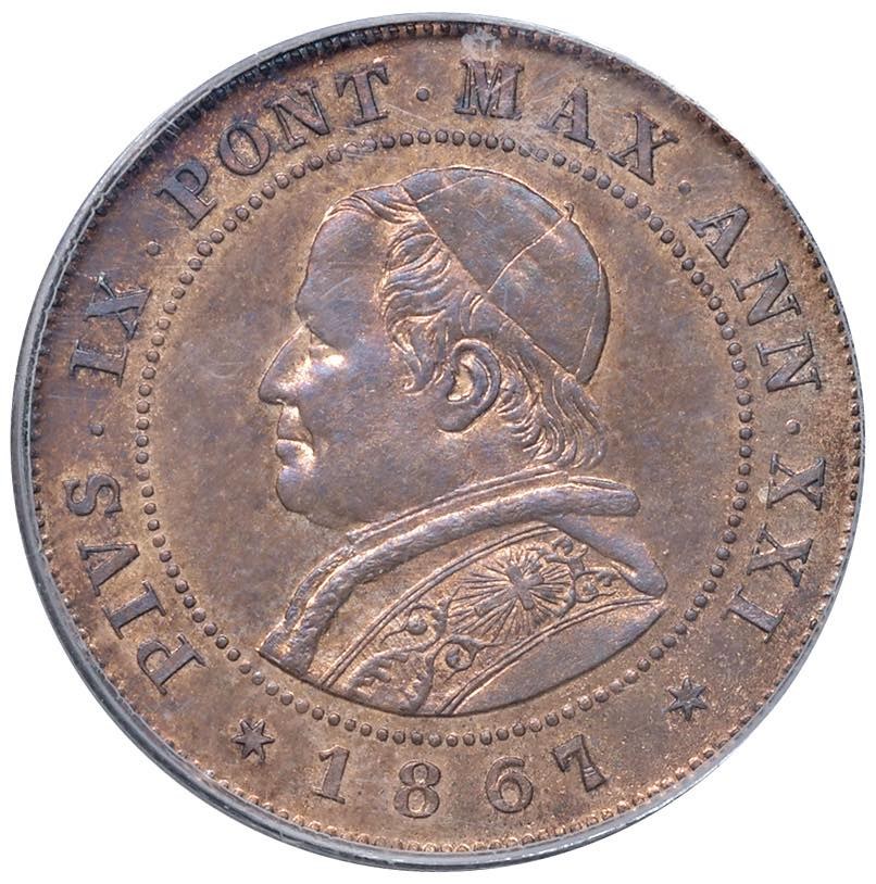 Pio IX (1846-1870) 2 Soldi 1867 A. XXI - Nomisma 901 CU In slab PCGS MS 64 RB cod. 15689854