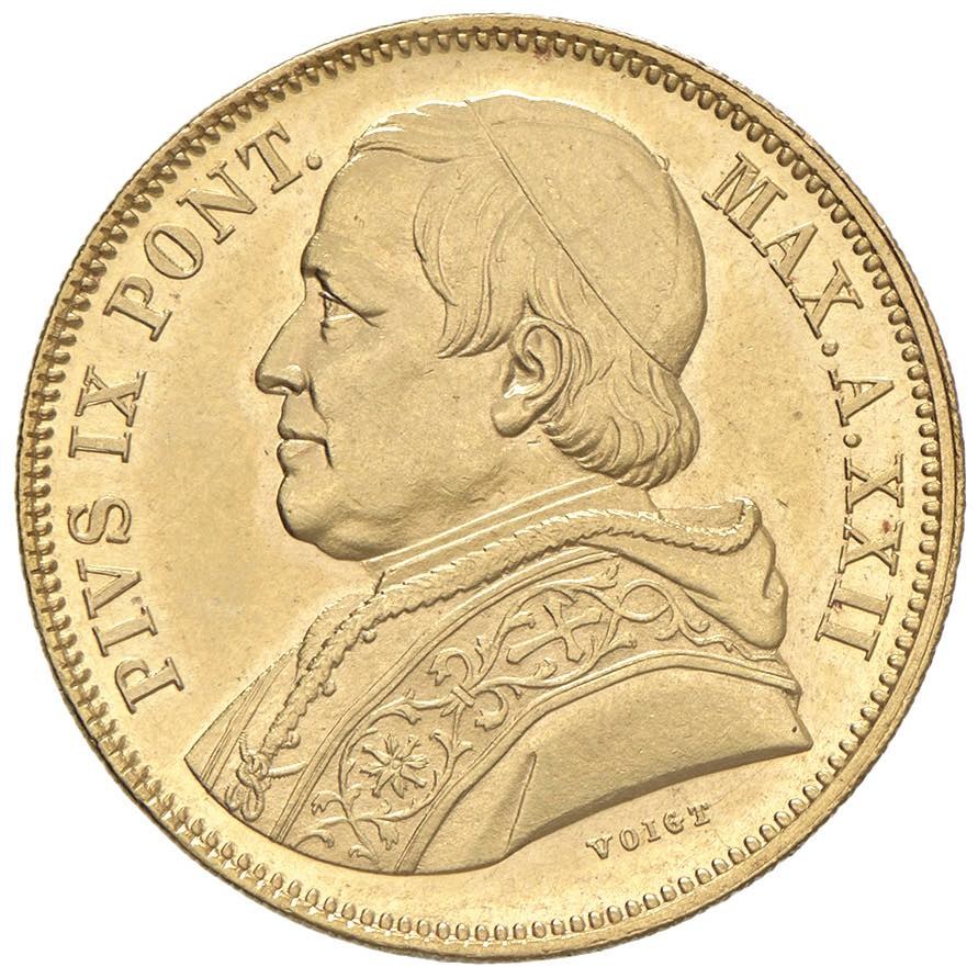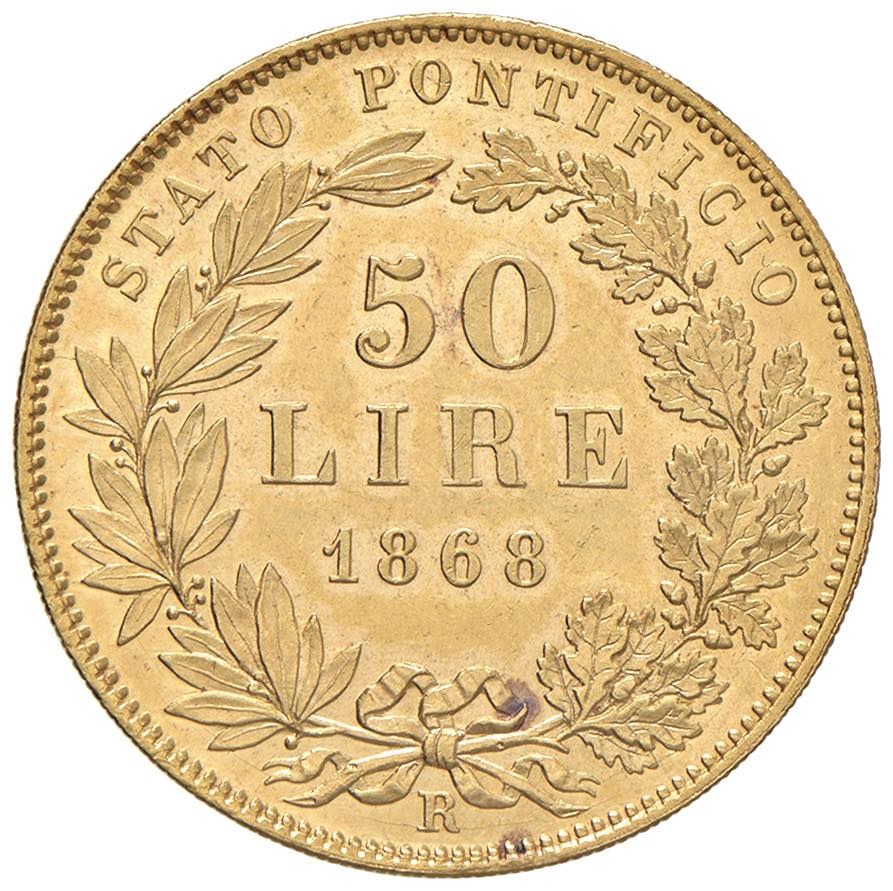 Pio IX (1846-1878) 50 Lire 1868 A. XXII - Nomisma 840 AU (g 16,17) RRR Conservazione ecceziionale