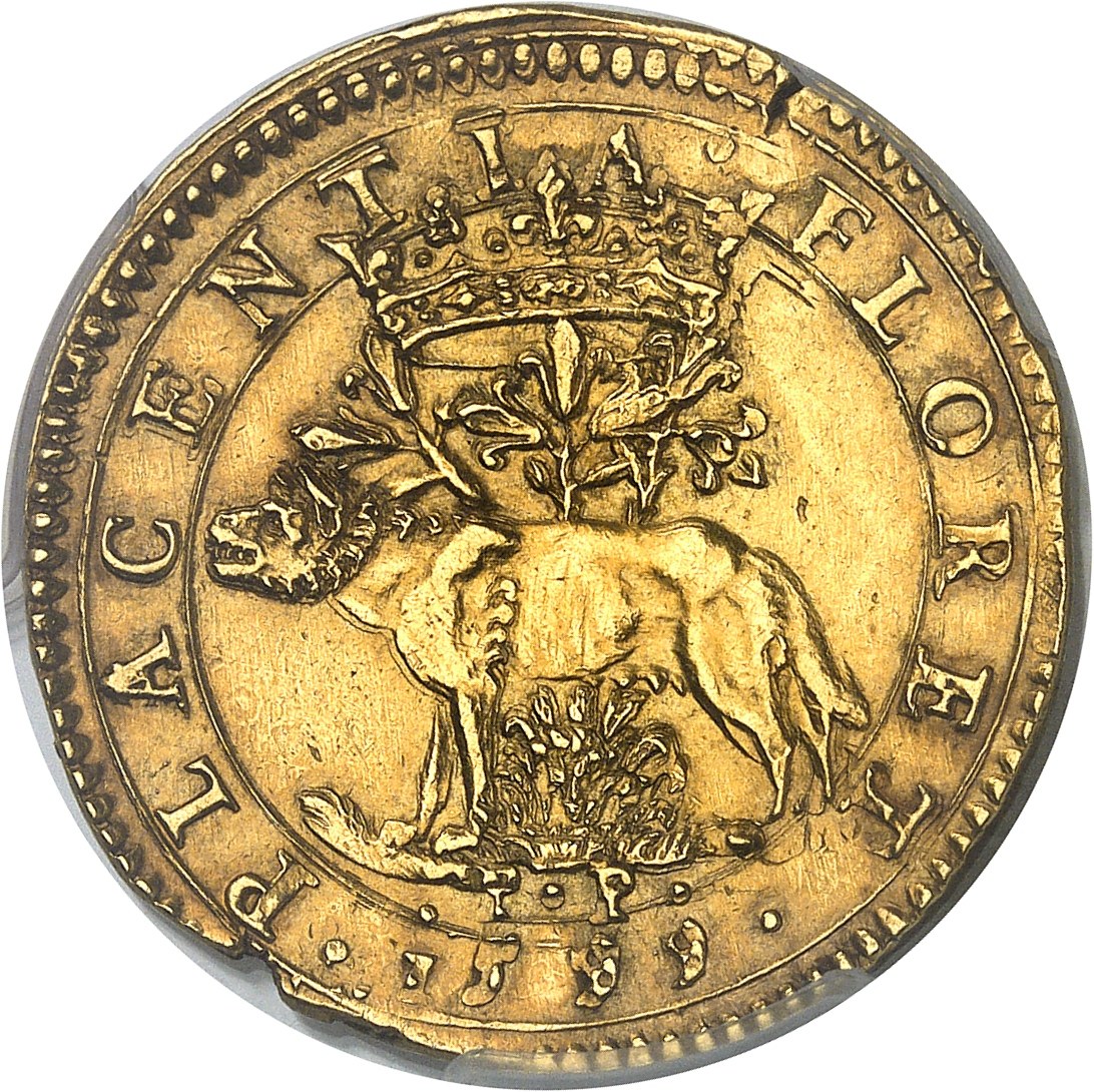 Rv. PLACENTIA. FLORET. Une louve à gauche devant trois fleurs de lis sous une couronne ducale ; à l’exergue (différent) et (date).