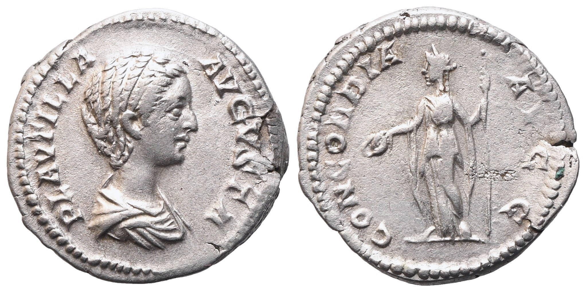 PLAVTILLA AVGVSTA Draped bust of Plautilla to r.; Rv. CONCORDIA AVGG Concordia standing front, head to l., holding patera in her r. hand and long sceptre in her l. BMC 411. Cohen 1. RIC 363a. Near extremely fine / god very fine.