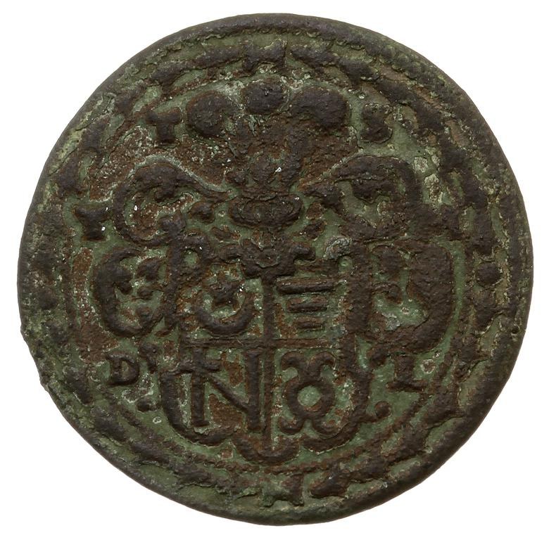Stefan Batory 1576-1586, podskarbiówka (liczman z mennicy wileńskiej), 1586 r, Teodor Tyszkiewicz Skumin, miedź 3.08 g, Demel 43, H-Cz. 4051(R7), bardzo rzadka, patyna