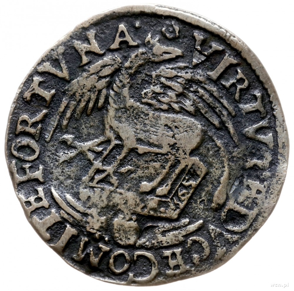 Jan Jerzy I 1615-1656, podskarbiówka z lat 1611-1656; Aw: Gryf i napis wokoło VIRTVTE DVCE COMITE FORTVNA; Rw: Słońce nad drzewkiem, wokoło napis FLOREB MVS PROSPICIENT DEO; ciemna patyna