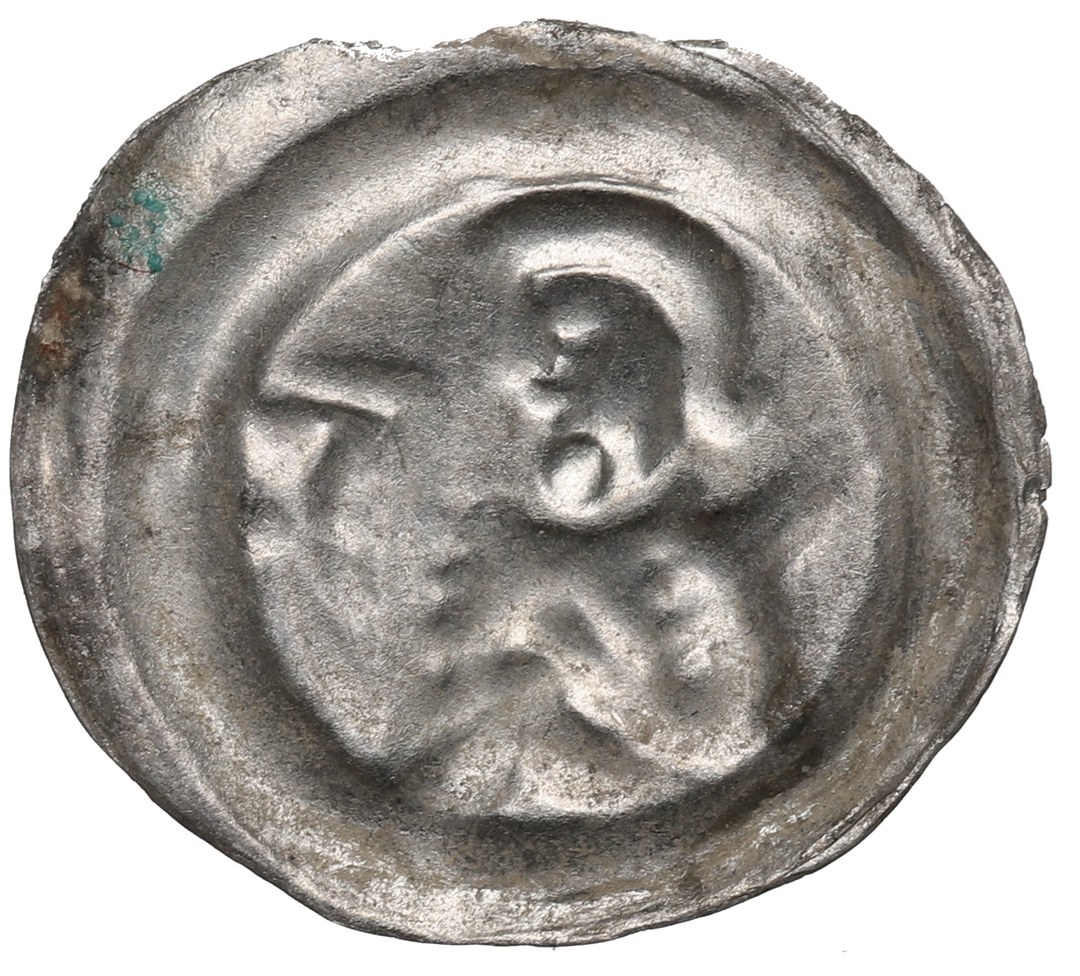 Znakomity brakteat piastowski, charakteryzujący się dojrzałym warsztatem rzeźbiarskim.