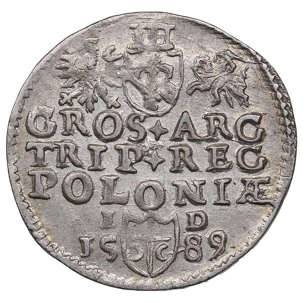 Rev.: Vasa arms between Polish and Lithuanian arms; above, III; legend in three lines “GROS+ARG TRIP+REG POLONIÆ”; below, Przegonia arms divides initials I-D of crown treasurer Jan Dulsky and date 15-89.