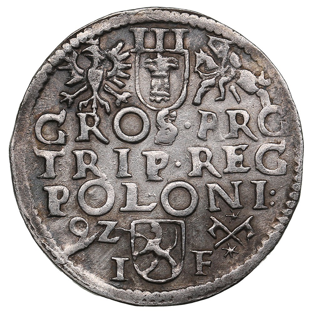 Rev.: Vasa arms between Polish and Lithuanian arms; above, III; legend in three lines “GROS·ARG ·TRIP·REG POLONI:”; below, Lewart arms of crown treasurer Jan Firley with initials I-F; date (15)·9Z· to left, crossed hooks with stars to right.