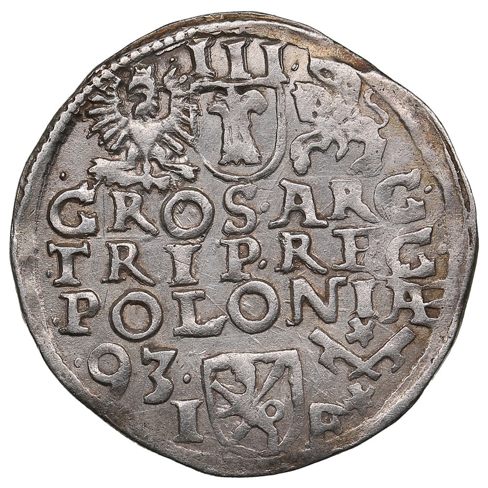 Rev.: Vasa arms between Polish and Lithuanian arms; above, ·III·; legend in three lines “·GROS·ARG· ·TRIP·REG· ·POLONIÆ”; below, Lewart arms of crown treasurer Jan Firley with initials I-F; date (15)·93· to left, crossed hooks with stars to right.