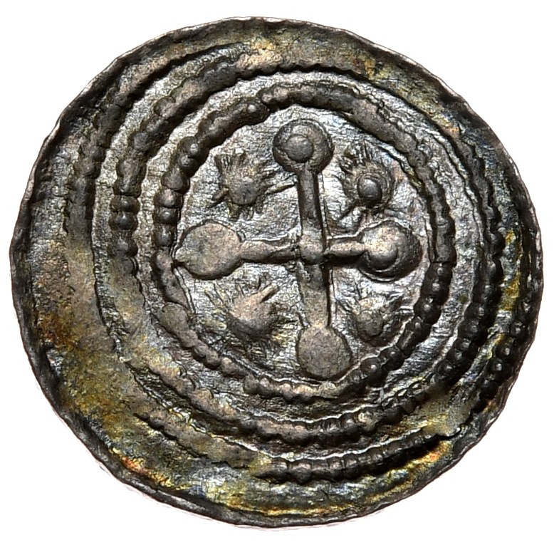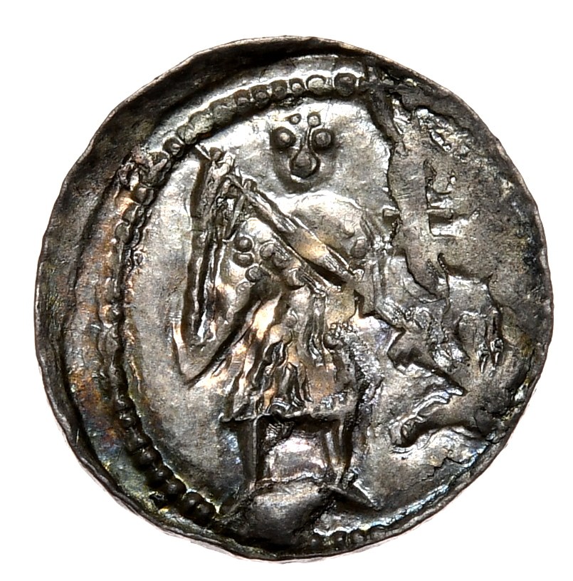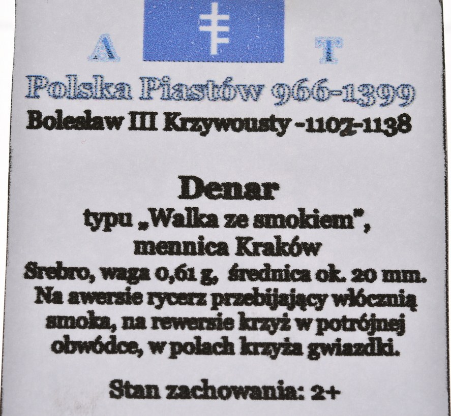 Piękny egzemplarz. Połyskowy w atrakcyjnej patynie. Na awersie rycerz przebijający włócznią smoka, na rewersie krzyż w potrójnej obwódce, w polach krzyża gwiazdki. Dołączona karteczka z kolekcji.