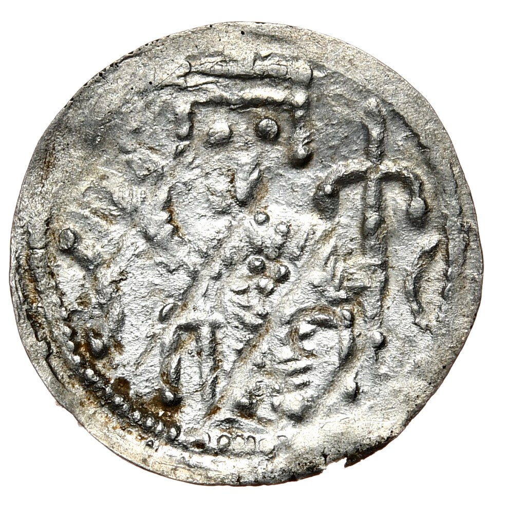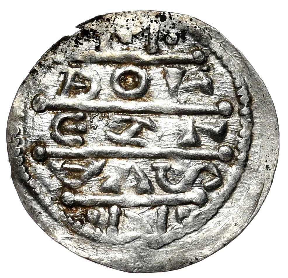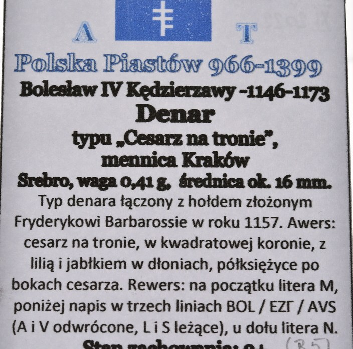 Piękny egzemplarz. Połyskowy. Denar związany z hołdem lennym złożonym przez księcia Bolesława Kędzierzawego cesarzowi Fryderykowi I Barbarossie w Krzyszkowie w roku 1157. Dołączona karteczka z kolekcji.