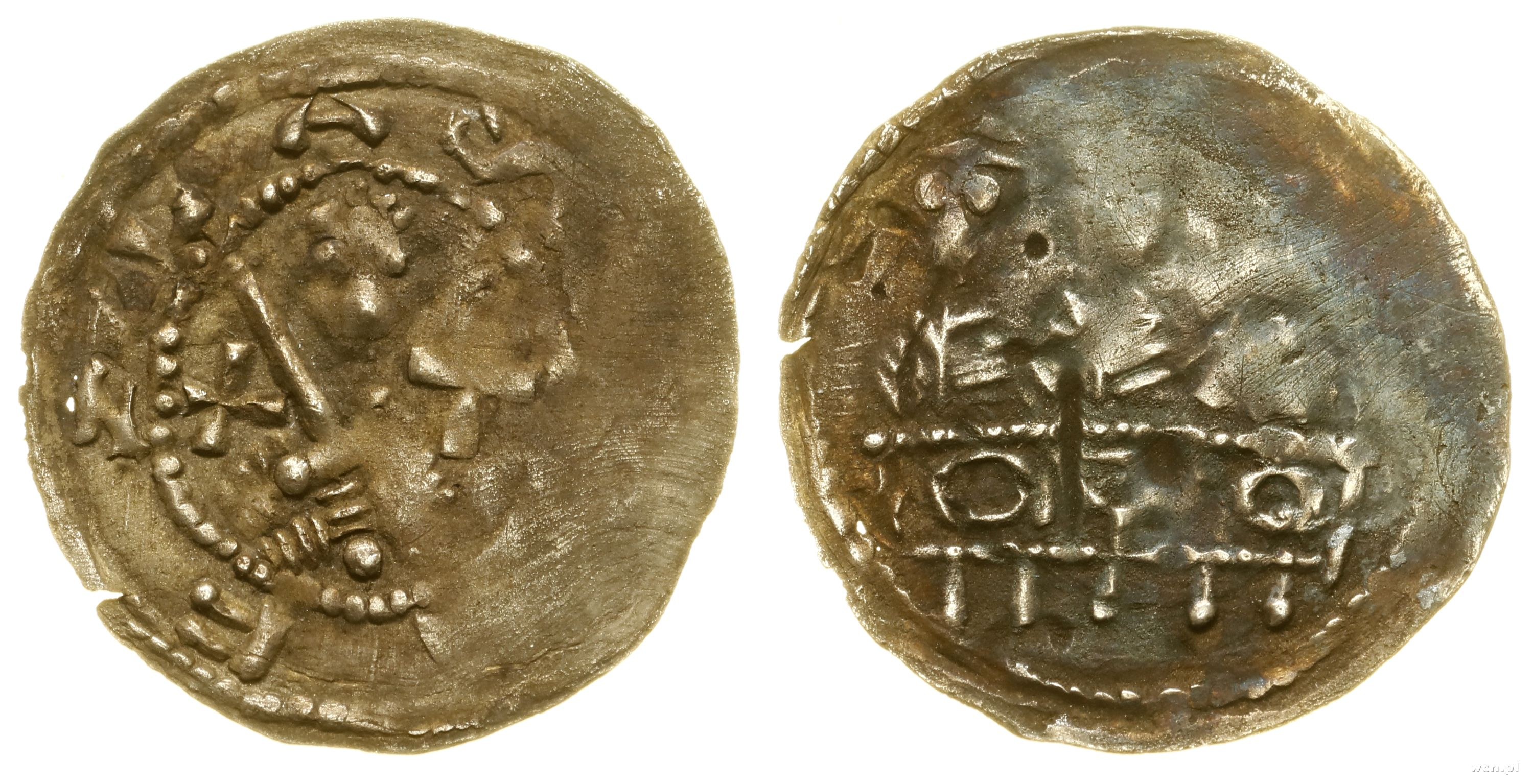 Aw: Popiersie księcia na wprost trzymającego miecz, po bokach dwa krzyże, ...LEZLAS; Rw: Trzej książęta za stołem na wprost