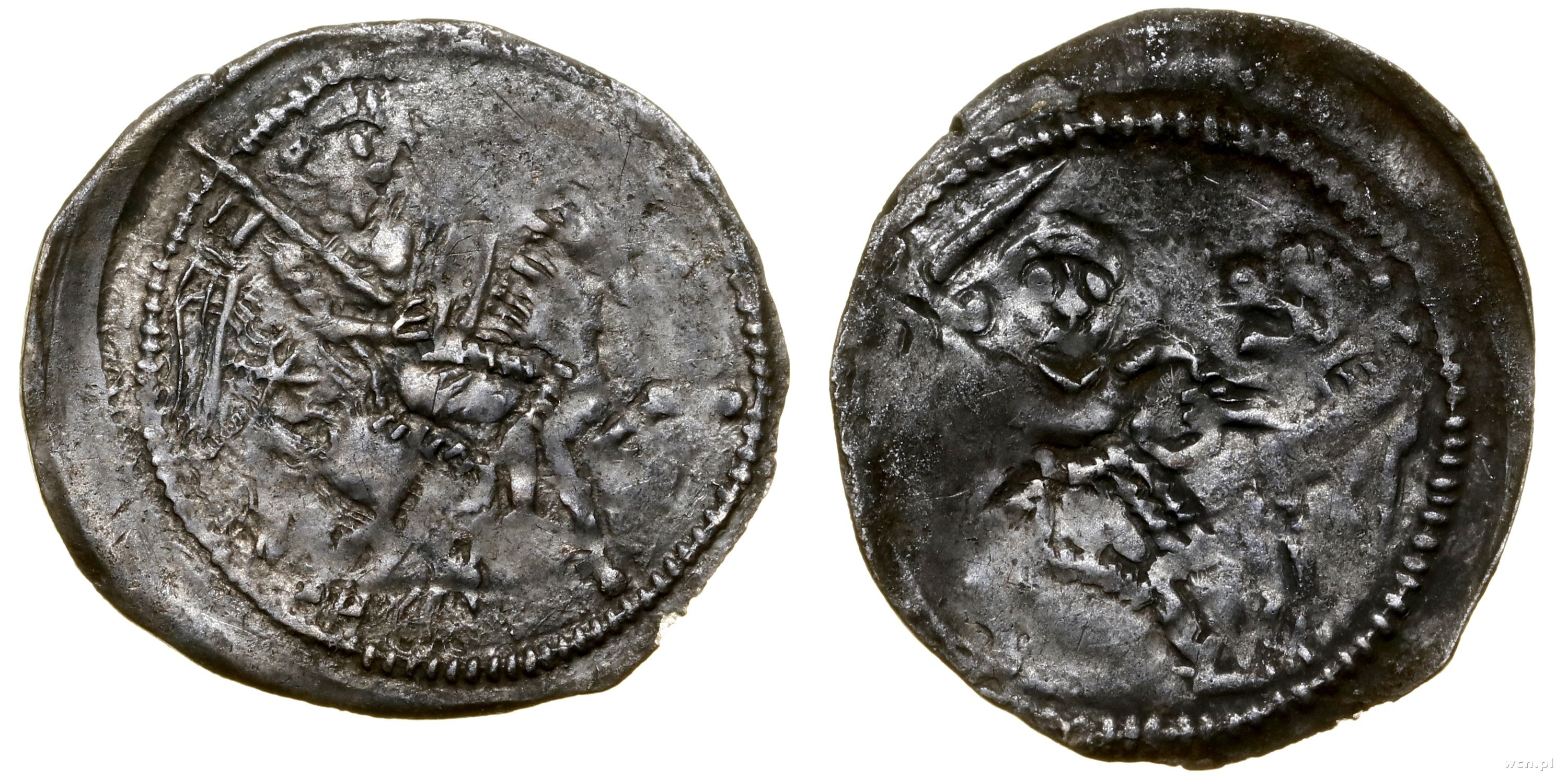 Aw: Postać na koniu, w prawo, trzymająca proporzec, wokół trzy gwiazdy; Rw: Rycerz walczący z lwem