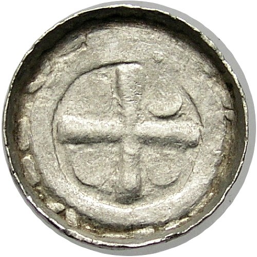 Rv. Krzyż kawalerski z v w jednym z kątów ramion krzyża. Polska, CNP ~ 846, odmiana z końca XI wieku, znana ze skarbu ze Słuszkowa (FMP I, 235 Słuszków, tab. XCII.