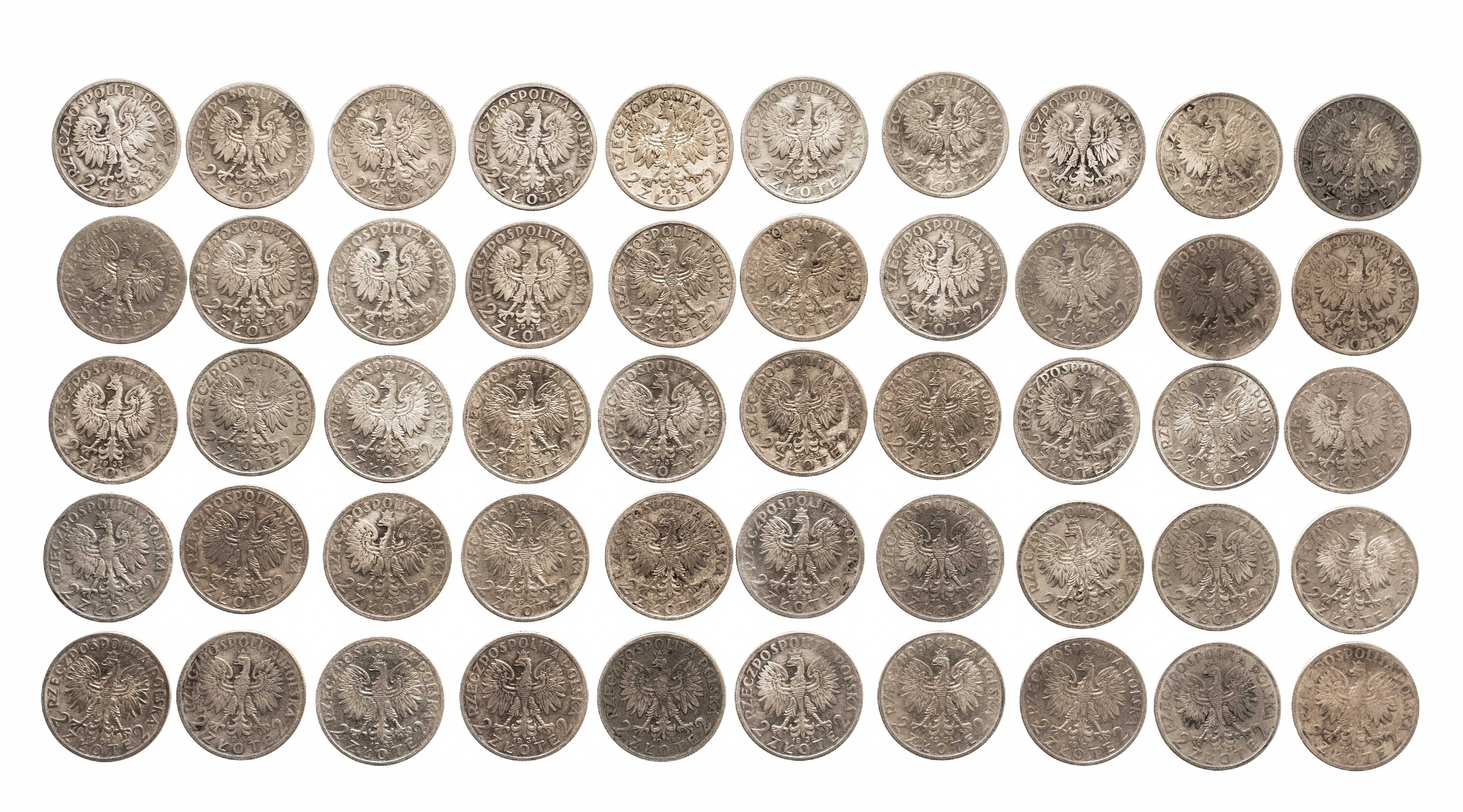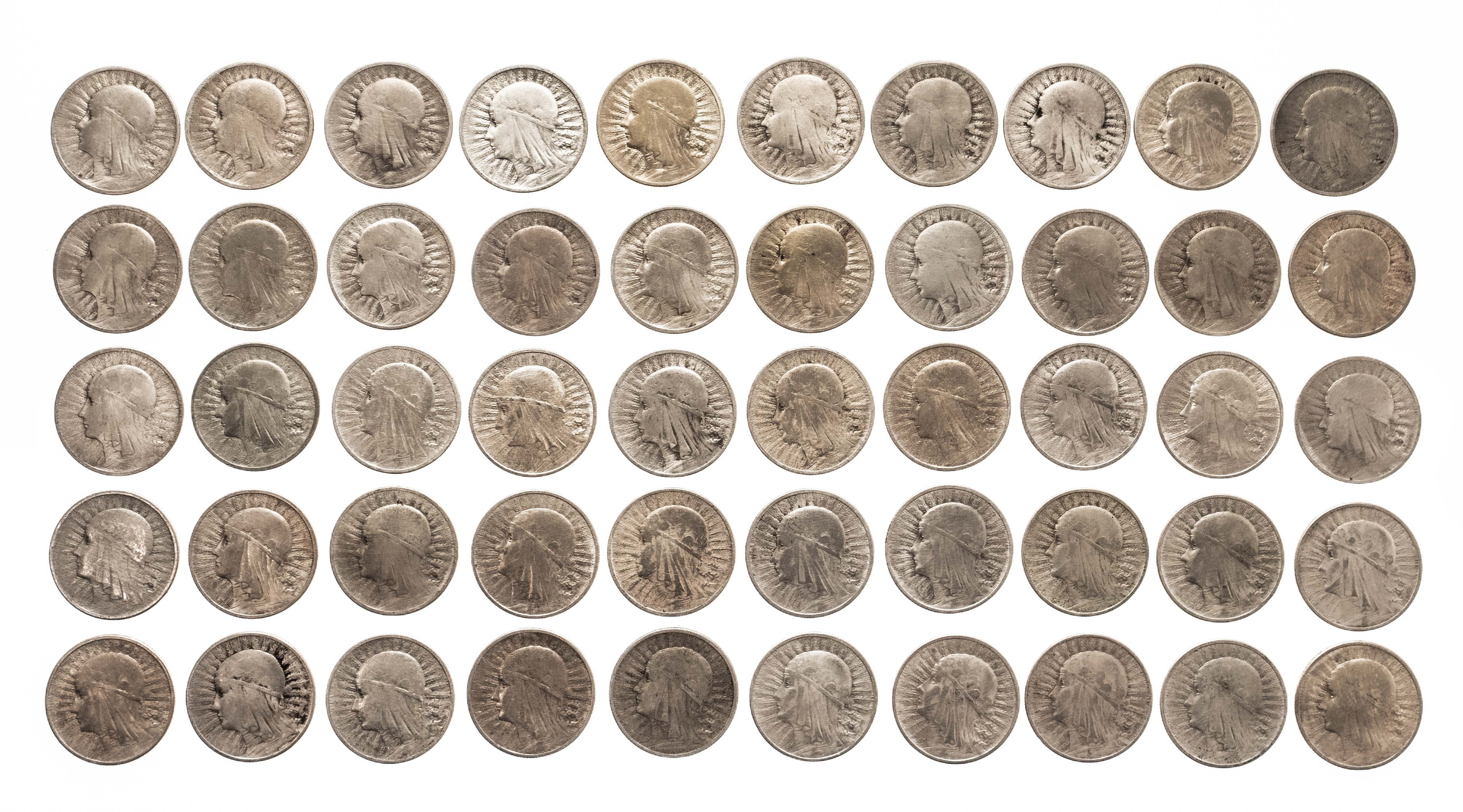 Monety w starej patynie z lustrem menniczym, niektóre przeczyszczone.