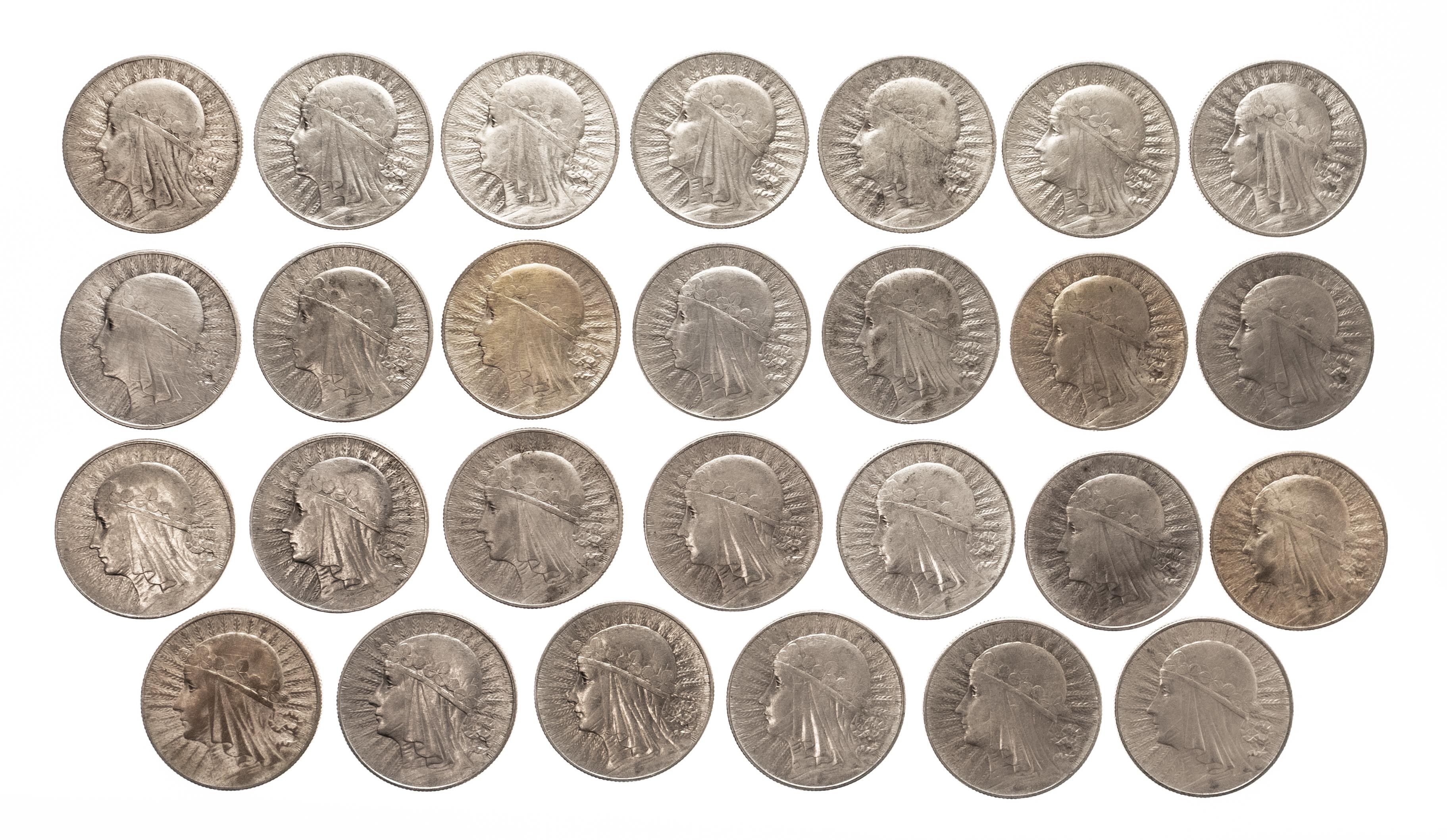 Monety w starej patynie z lustrem menniczym, niektóre częściowo przeczyszczone.