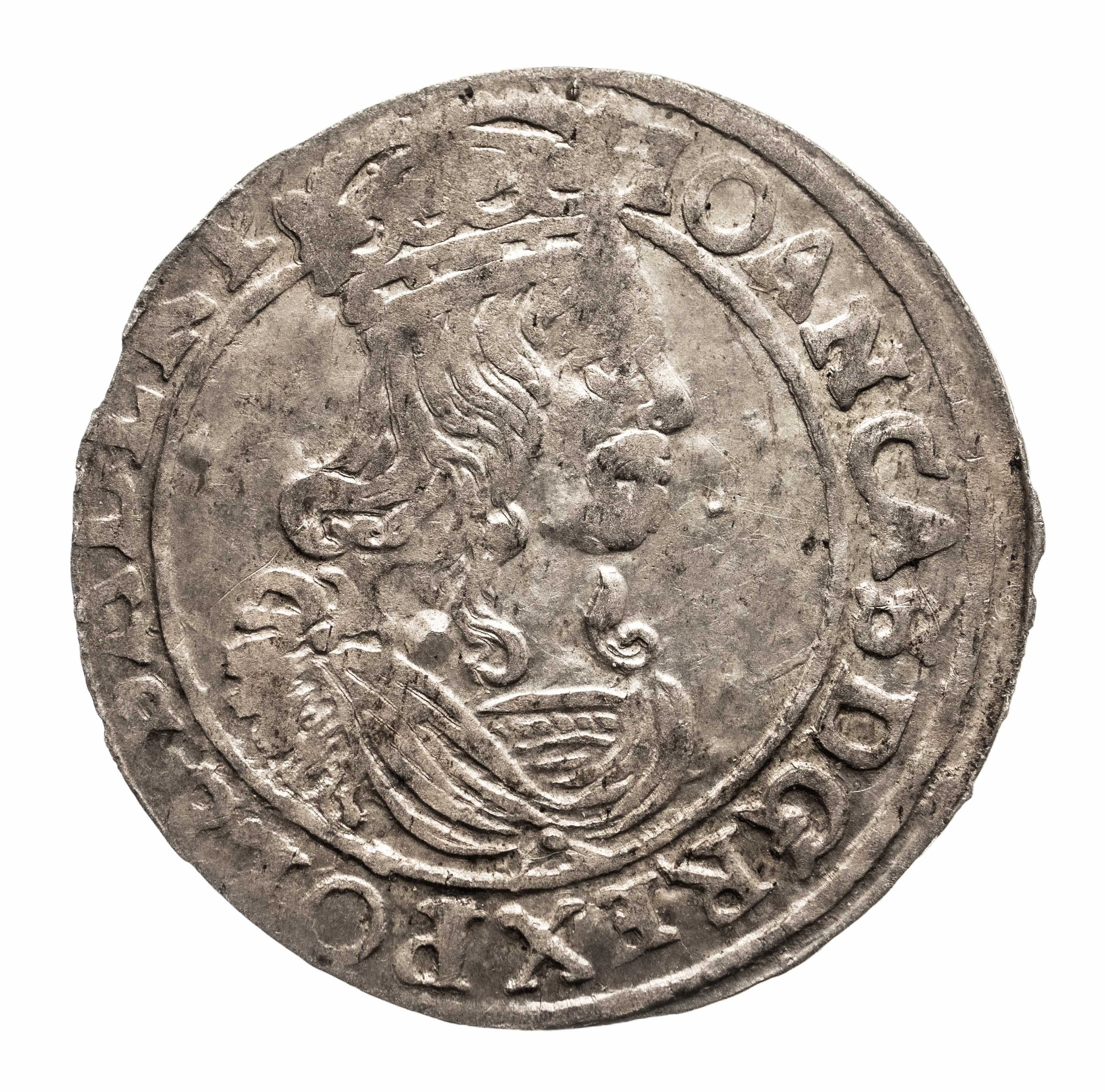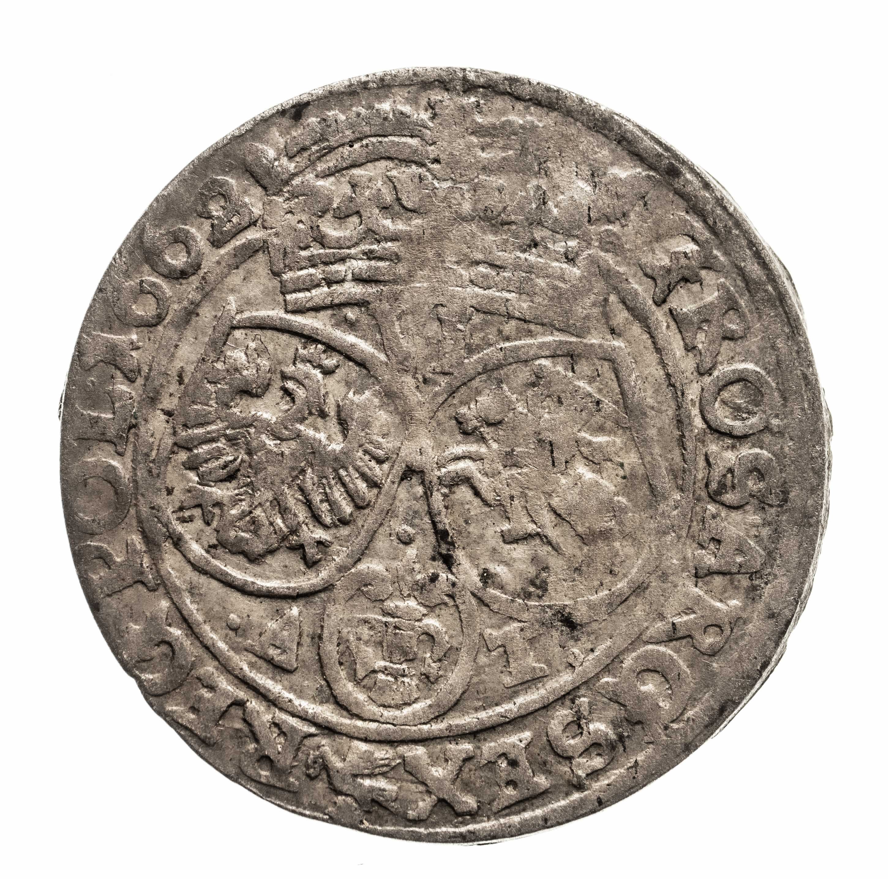 Odmiana z inicjałami A-T po bokach tarczy ze Snopkiem i tarczami z herbami Polski i Litwy lekko wgiętymi.