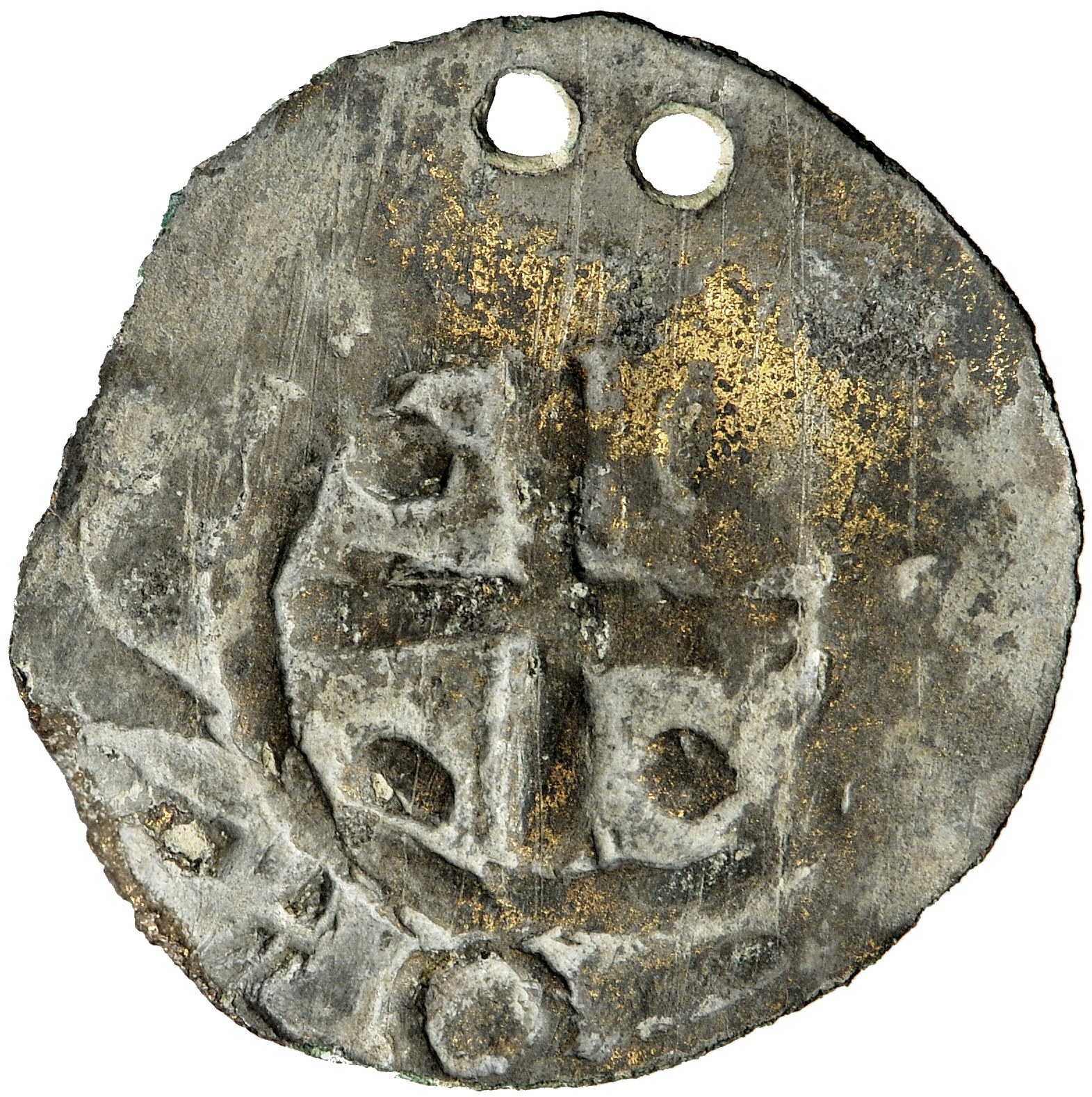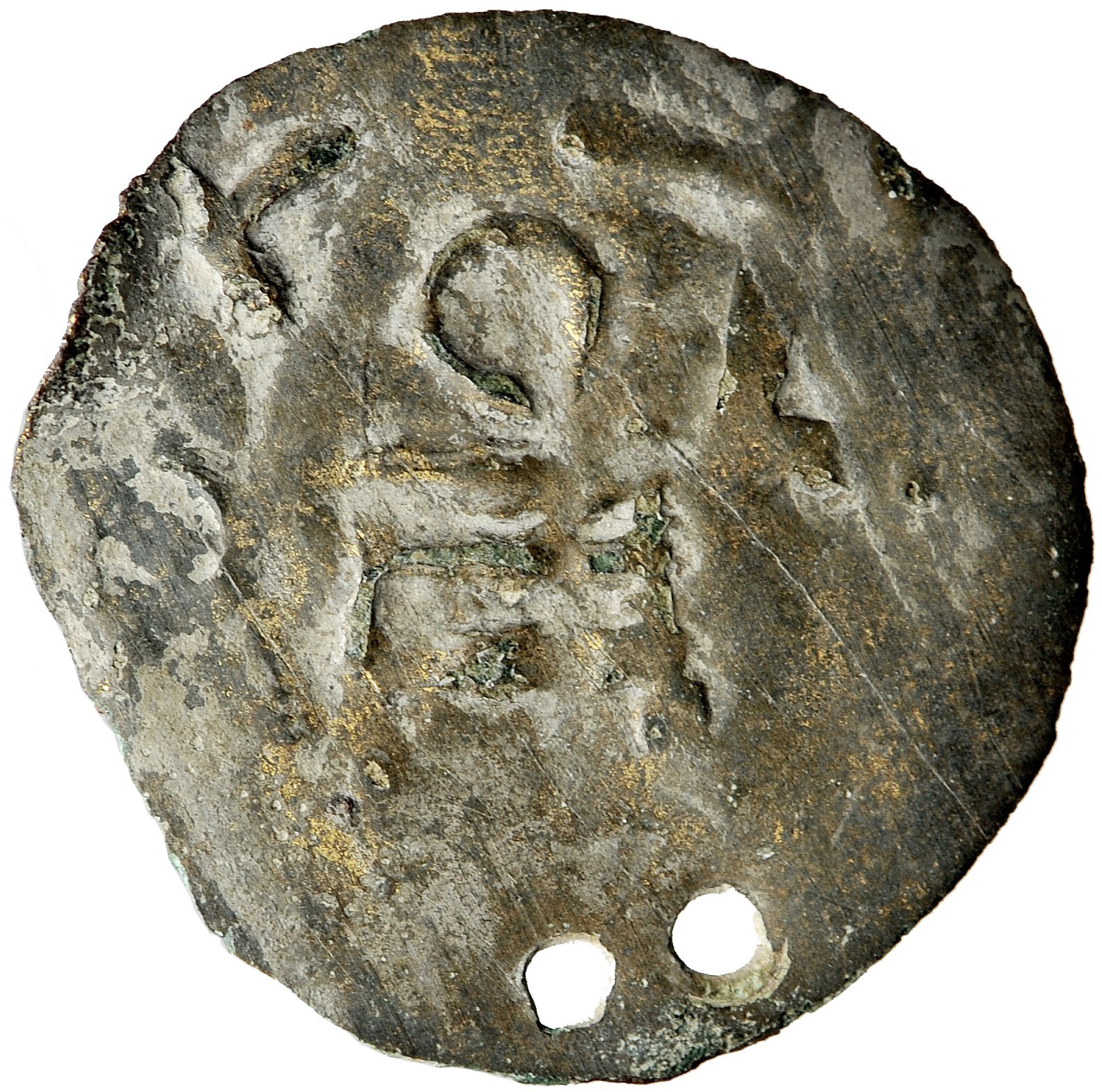 Żółty brąz (mosiądz? orichalcum?), 0,82 g, 20,1 mm. Cienki krążek cięty nożycami, wywiercone w epoce dwa małe otworki do zawieszania. Brak analogii (M. Bogucki, WN 2008, podobny Av. na ryc. 6, z Wolina).