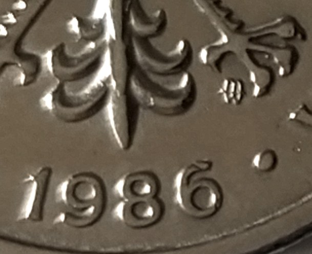 Rzadka odmiana z dużymi cyframi daty, ze znakiem menniczym pochylonym w prawo. Moneta delikatnie przetarta.