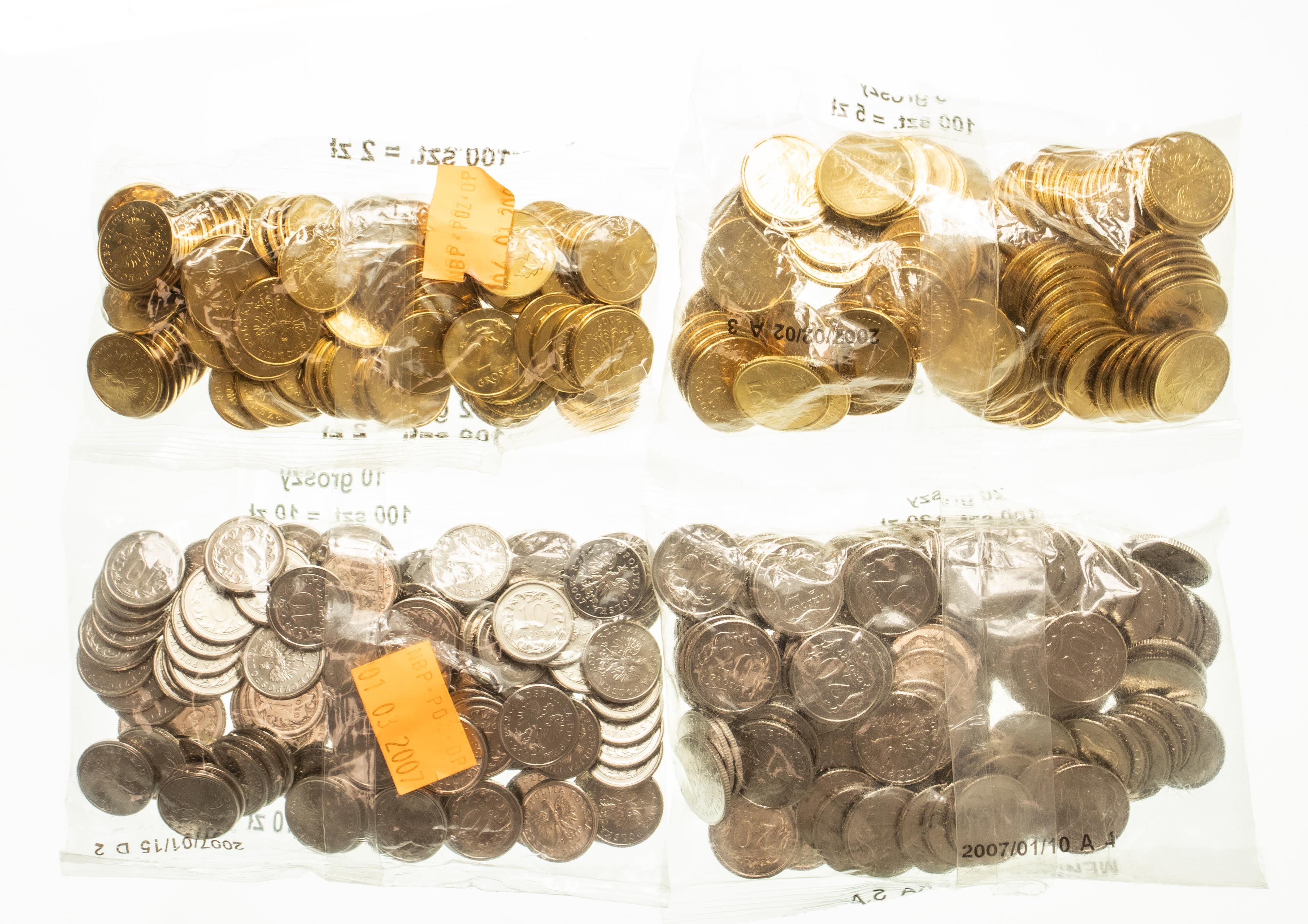 4 woreczki bankowe z menniczymi monetami groszowymi z 2007 roku. Czterysta sztuk.