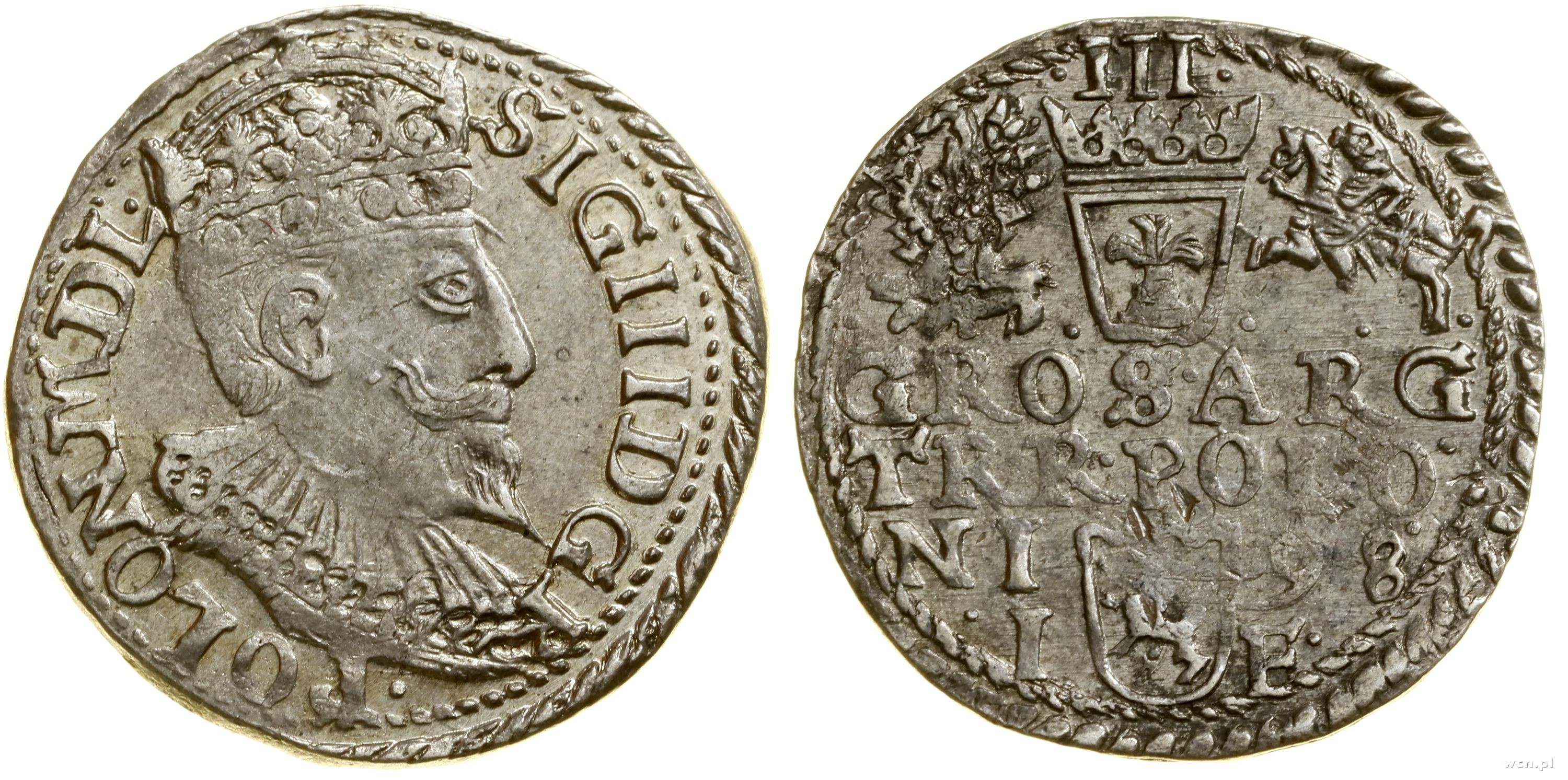 głowa króla z krótką brodą i koroną z wysokim rondem, wariant z POLON w legendzie awersu