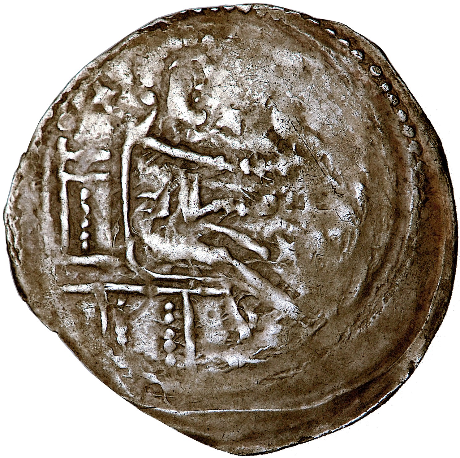 Rv. Postać męska w długiej szacie siedzi na łuku na wprost, w dłoniach wznosi dyski z kulkami w środkach (prawy niemal niewidoczny), lewa ręka w szerokim rękawie, z boków głowy gwiazdki, z lewej strony nad tęczą popiersie męskie z profilu, zwrócone ku siedzącej postaci, z prawej niezrozumiały przedmiot (być może siedzący orzeł w lewo); słaby ślad wcześniejszego odbicia stempla nad głową siedzącego.