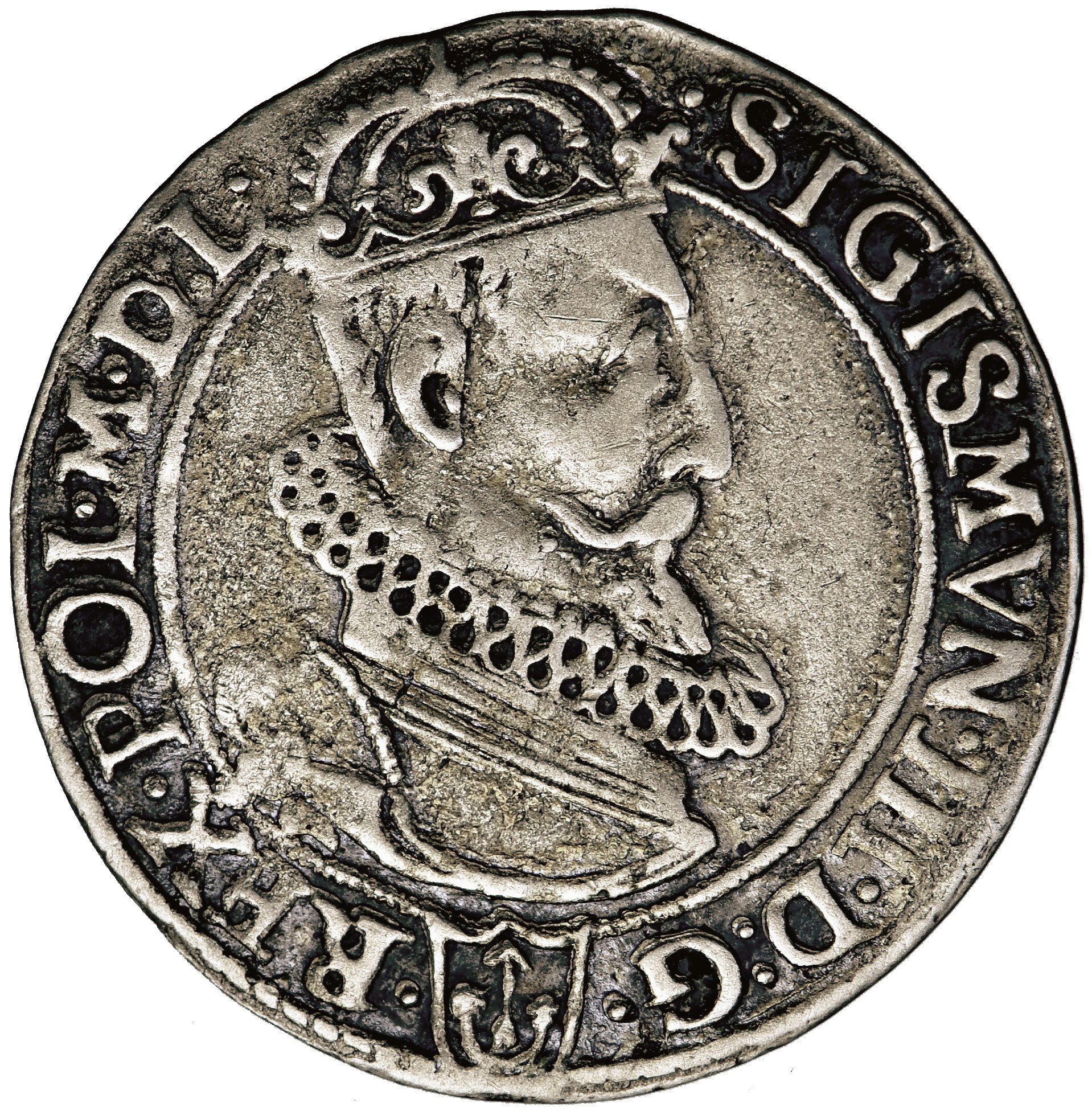 Wariant z napisem SIGISMVN w legendzie awersu, cyfry daty na rewersie pod koroną, rozdzielone oznaczeniem nominału.