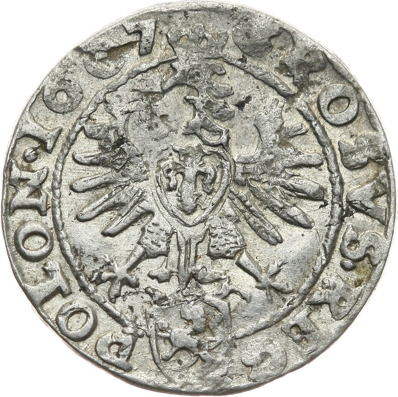 Typ z popiersiem króla, herb Lewart w prostej tarczy. Moneta z połyskiem w tle.
