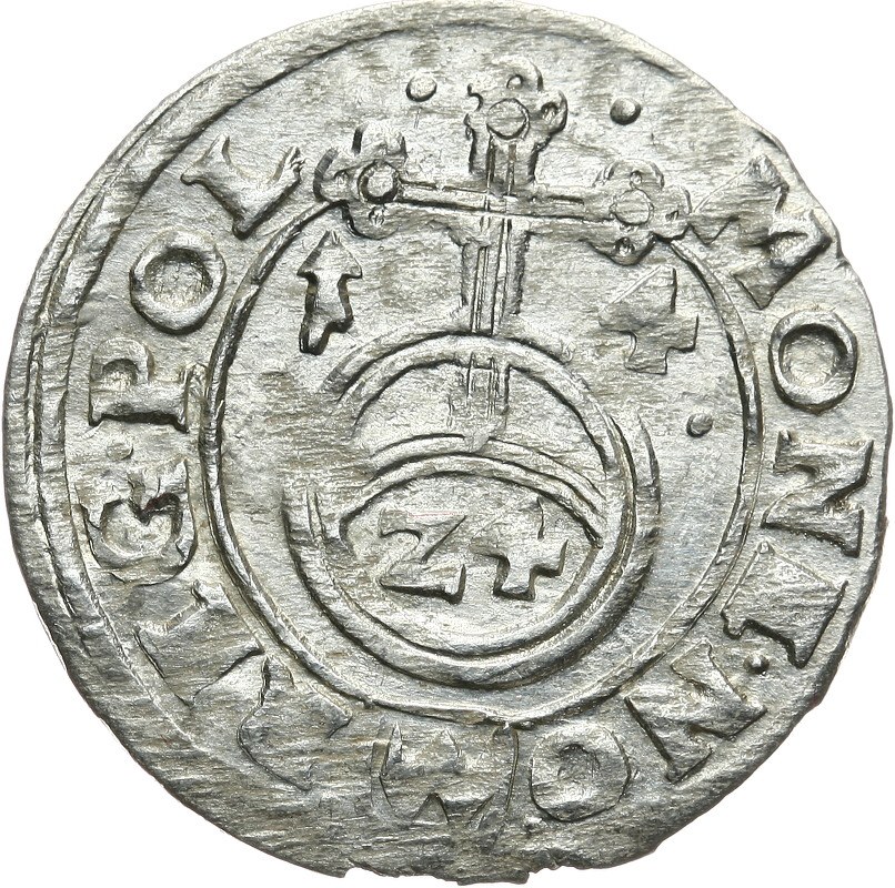 Rzadka odmiana z datą pod ramionami krzyża, na rewersie z końcówką POL, na awersie SIGI 3, kropki po bokach krzyża oraz po bokach daty, blask menniczy na monecie.