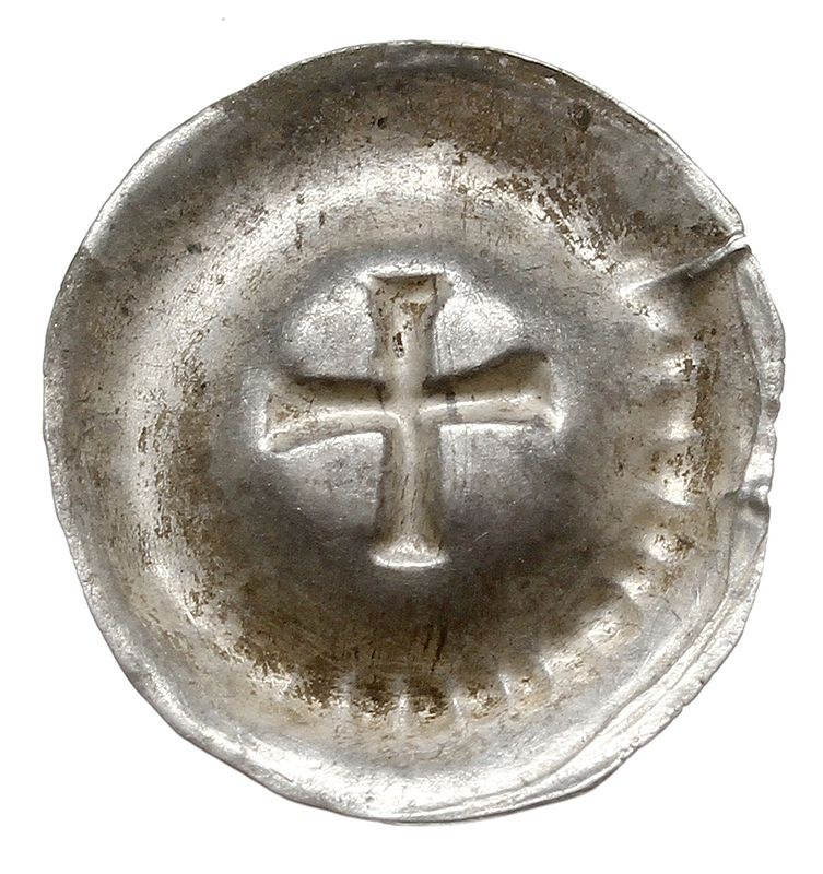brakteaty Polskie z XIII i XIV w., polskie naśladownictwo brakteata krzyżackiego typu Krzyż grecki”, 2. połowa XIII w., Krzyż prosty, na wale otokowym obwódka perełkowa, srebro 0.28 g, Paszkiewicz E1.3, Waschinski 16c
