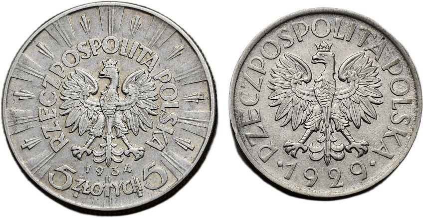 Polsko 1918-1939, 5 zlotých 1934, 1 zlotý 1929