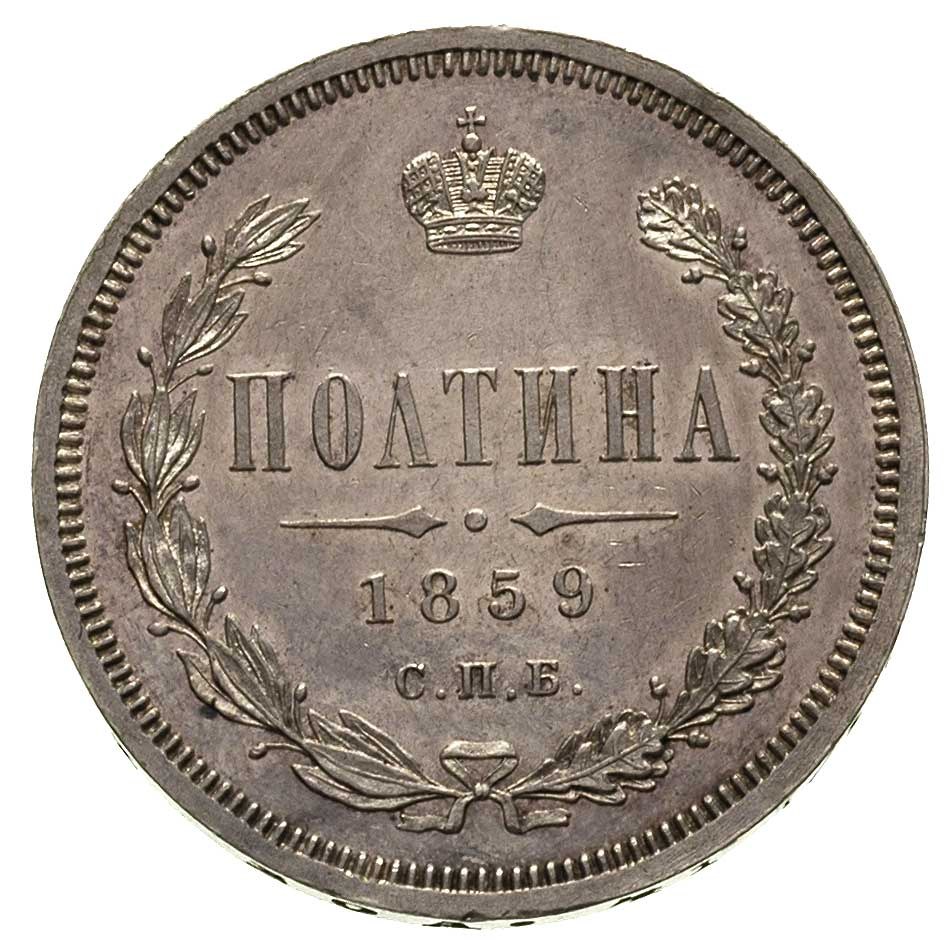 Aleksander II 1855-1881, połtina 1859, Petersburg, odmiana z wąską koroną na rewersie, Bitkin 97, ładne lustro mennicze, piękny egzemplarz